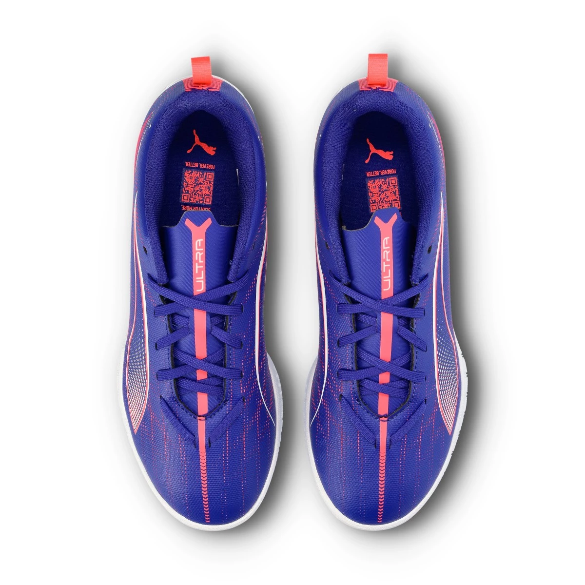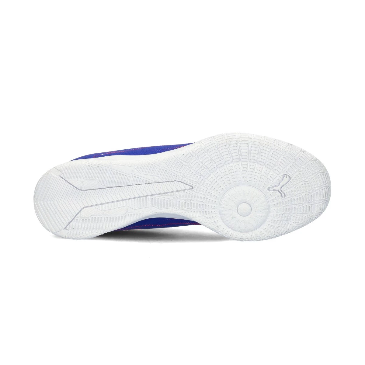 Chaussures de football Puma Ultra Play IT pour enfant. Chaussures synthétiques pour une utilisation sur des terrains en béton et en parquet. Chaussures bas de gamme en coloris Lapis Lazuli-White-Sunset Glow.
