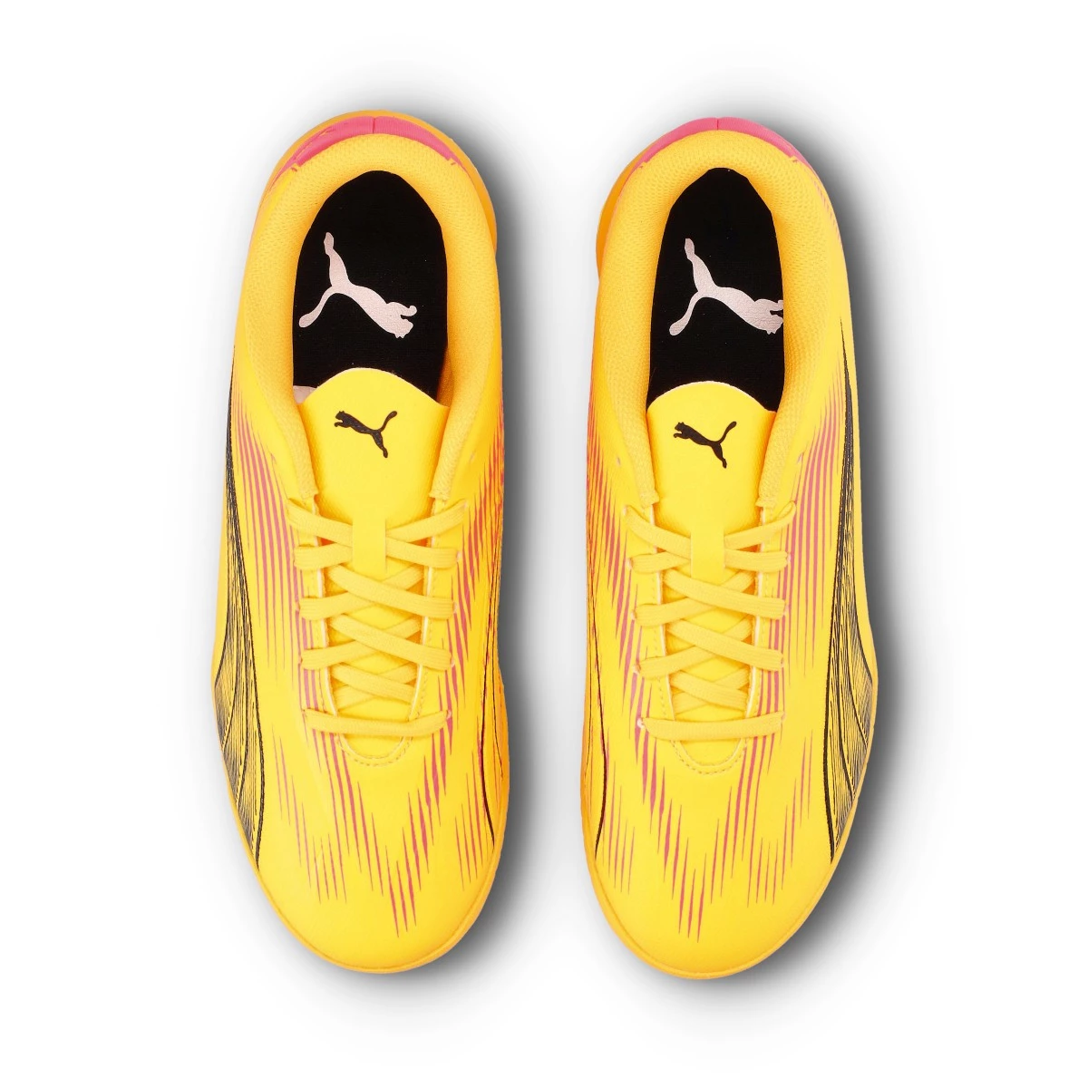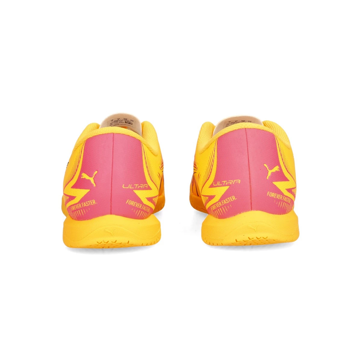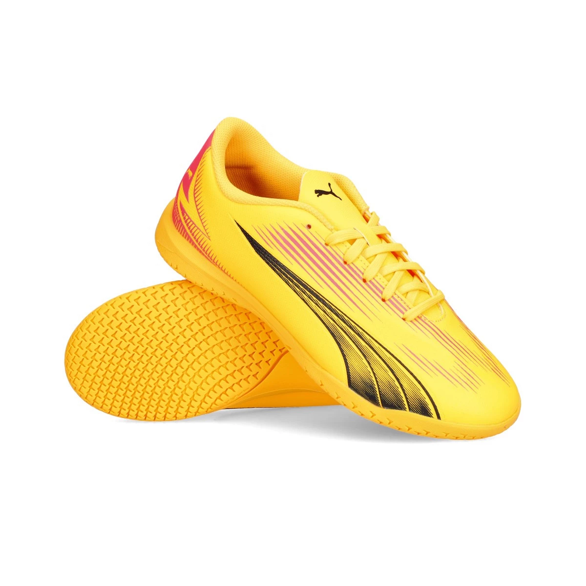 Chaussures de football Puma Ultra Play IT pour enfants. Chaussures synthétiques pour utilisation sur les terrains en béton et en parquet. Chaussures bas de gamme en couleur Sun Stream-Black-Sunset Glow.