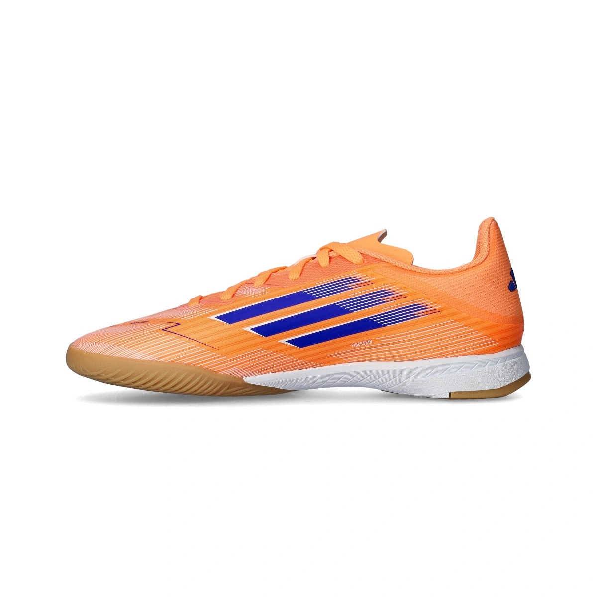Chaussures F50 League IN de la marque adidas, couleur Beam Orange-Lucid Blue-White, pour enfant.