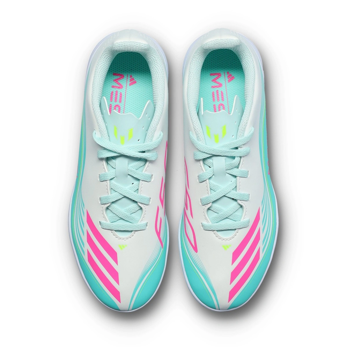 Chaussure F50 Messi Club IN pour enfant de la marque adidas en coloris White-Lucid Pink-Flash Aqua. Chaussure d'entrée de gamme pour terrains intérieurs.