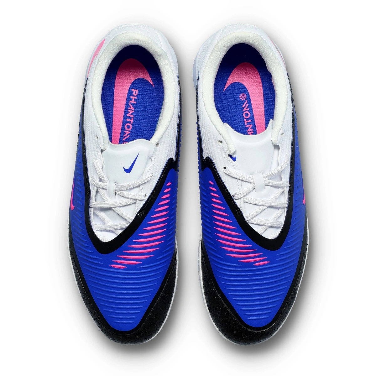 Chaussure de futsal Nike Phantom 6 Low Academy IC. Chaussure de futsal en maille sans chaussette, à utiliser sur terrains en ciment, parquet ou moquette. Chaussures de gamme intermédiaire pour les joueurs de contrôle et de précision en coloris Racer Blue-Pink Blast-White.