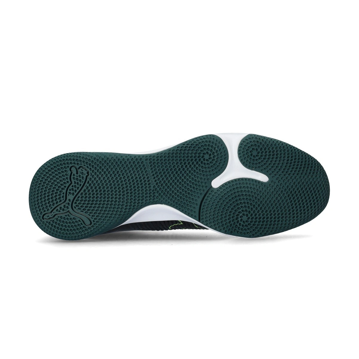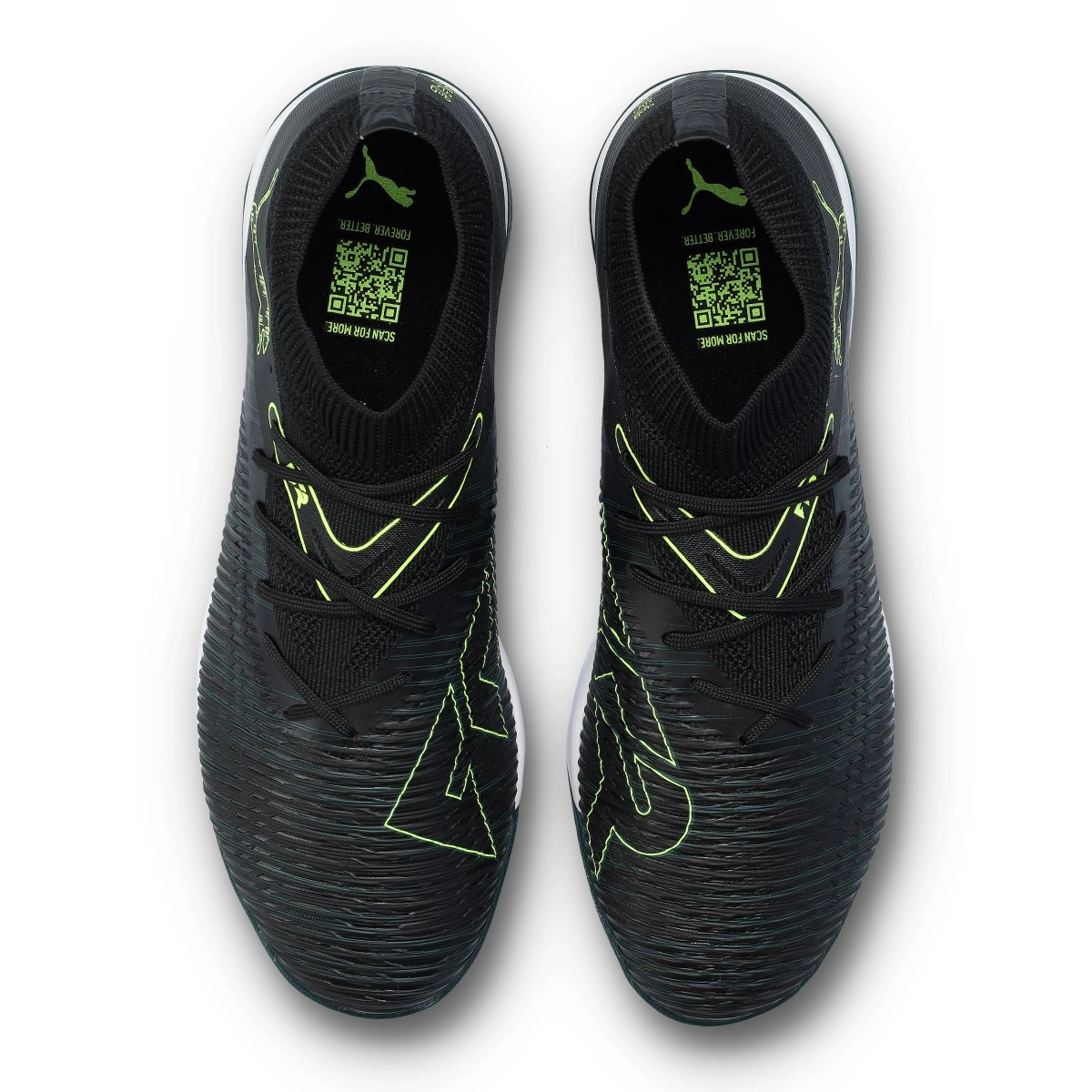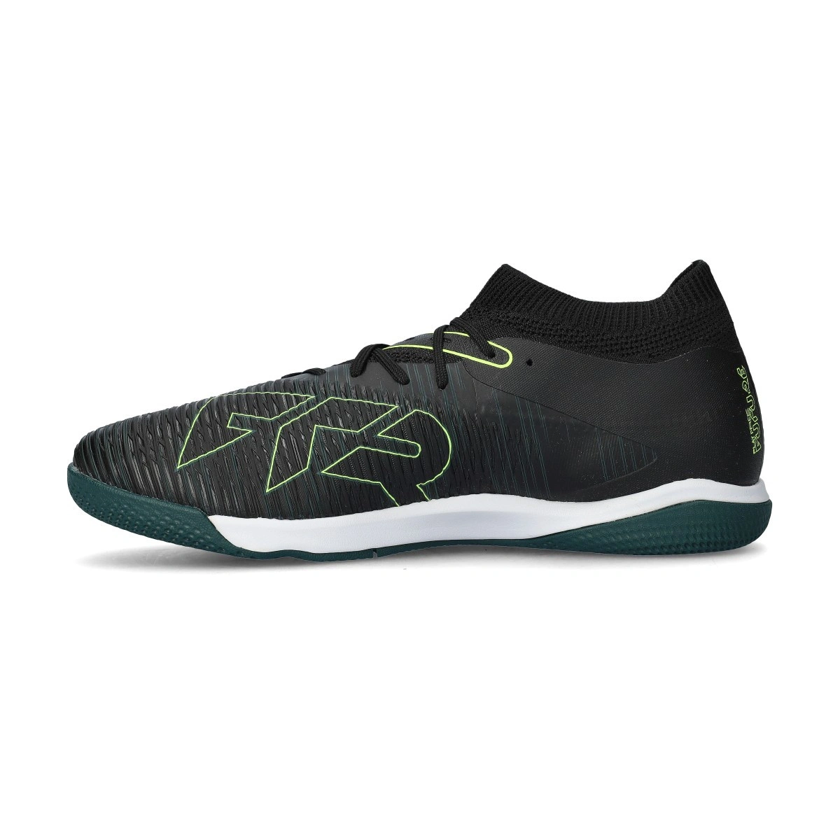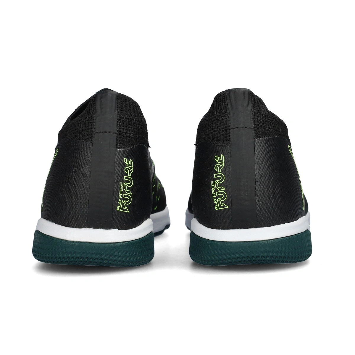 Chaussure de futsal Puma Future 8 Match IT Mid. Chaussures synthétiques à utiliser sur les terrains intérieurs. Chaussures millieu de gamme en couleur Black-Fizzy Light-Green Terrain.
