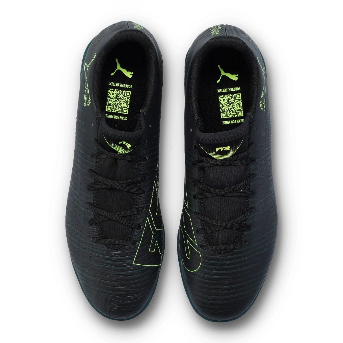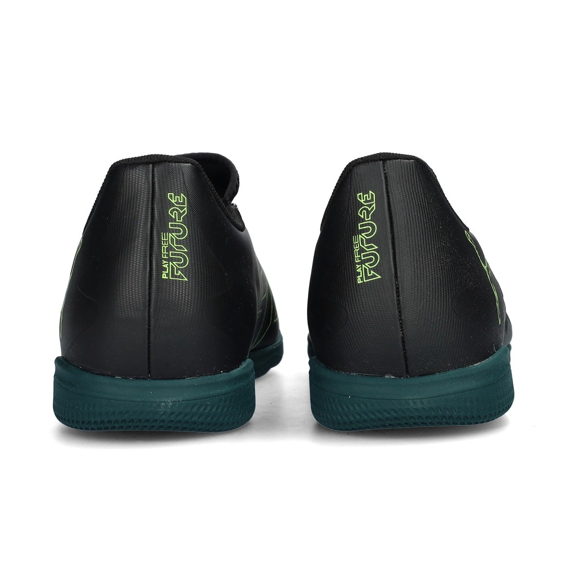 Chaussure de futsal Puma Future 8 Play IT. Chaussures synthétiques à utiliser sur les terrains intérieurs. Chaussures haut de gamme en couleur Black-Fizzy Light-Green Terrain.