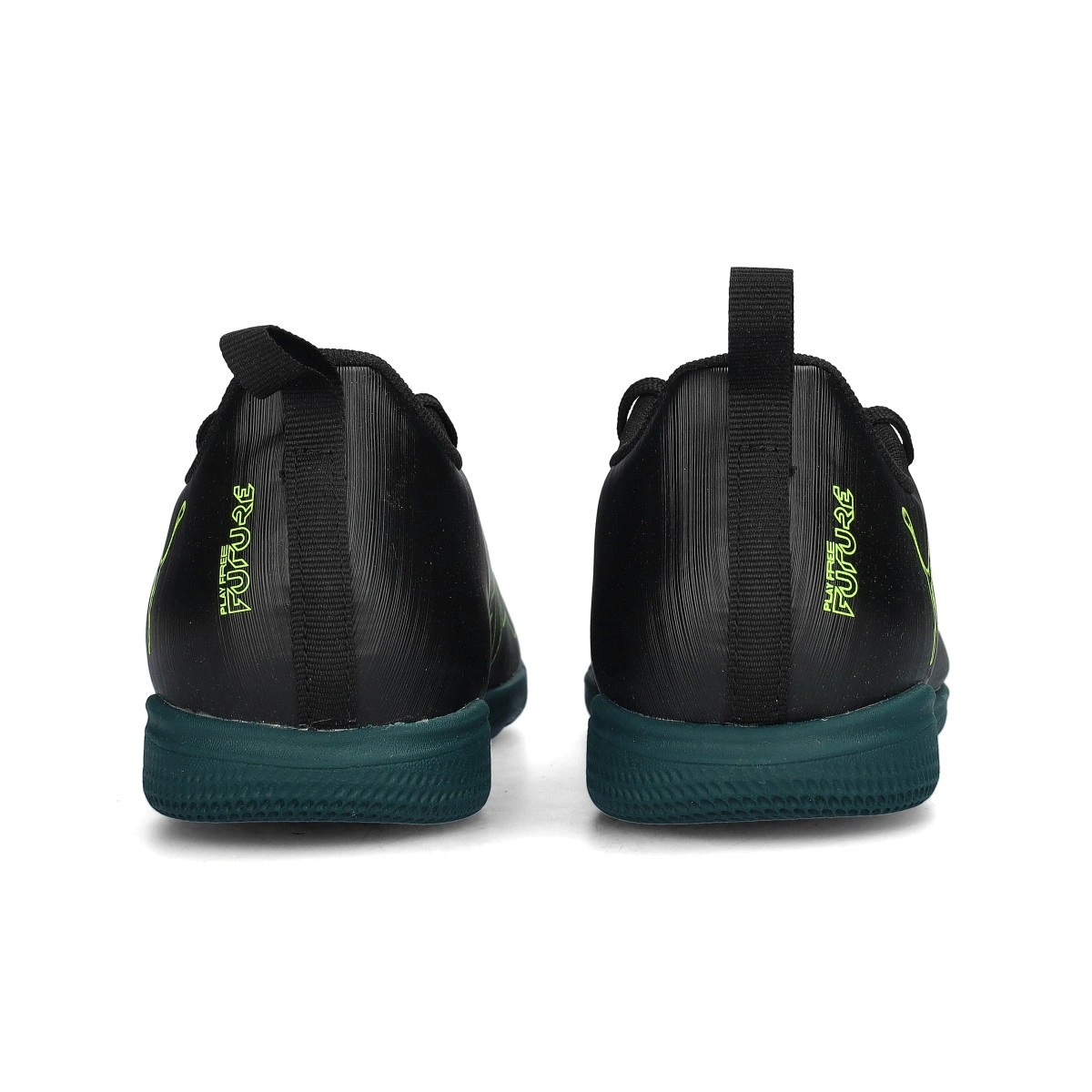 Chaussure de futsal Puma Future 8 Play IT pour enfant. Chaussures synthétiques à utiliser sur les terrains intérieurs. Chaussures haut de gamme en couleur Black-Fizzy Light-Green Terrain.