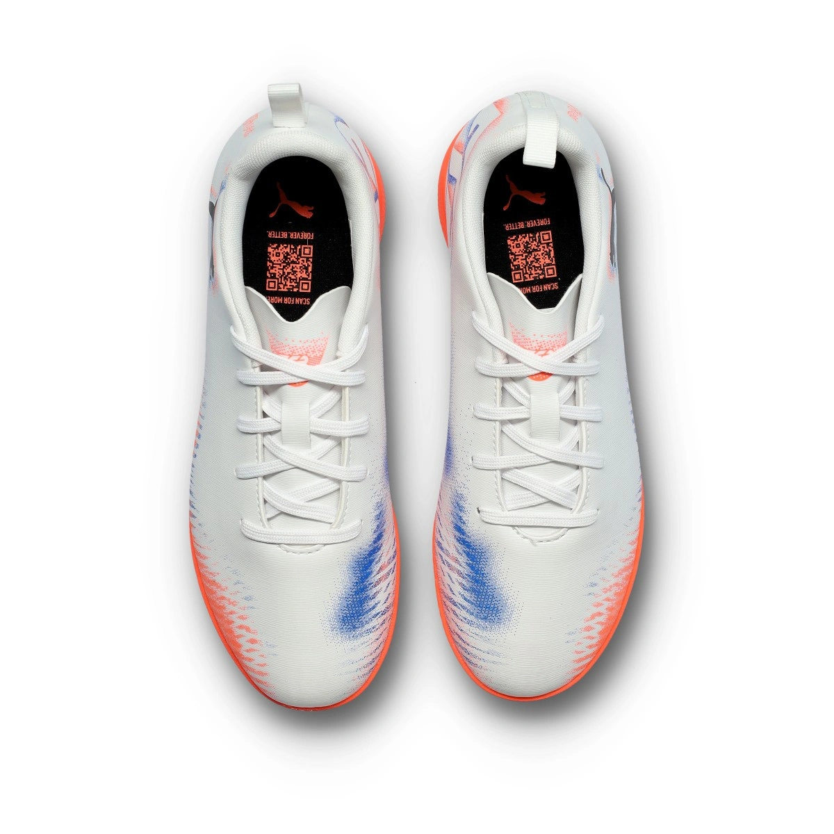 Chaussures de futsal Puma Future 8 Play IT avec lacets pour enfants. Bottes synthétiques pour utilisation sur terrains intérieurs. Chaussures haut de gamme PUMA White-PUMA Black-Glowing Red.