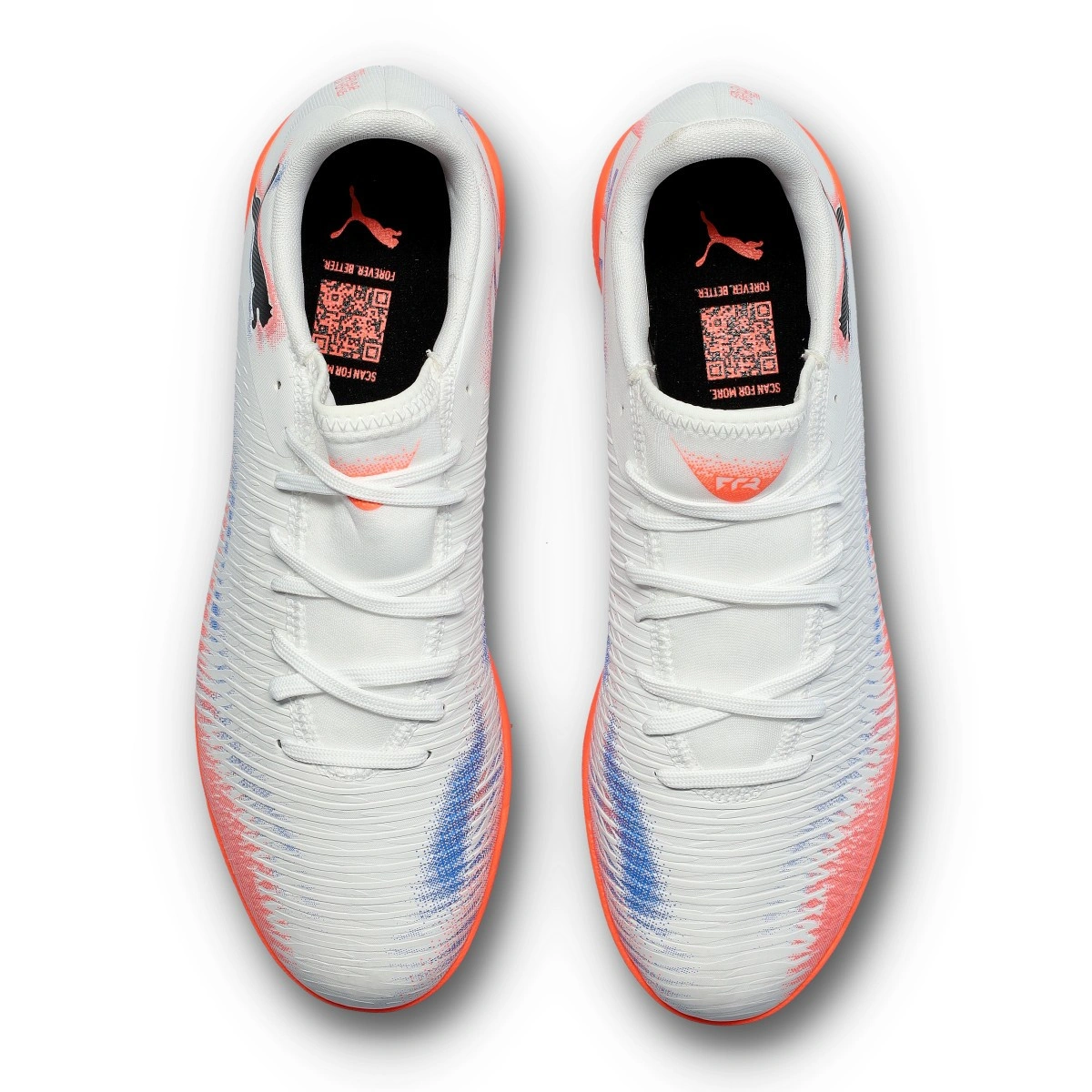 Chaussures de futsal Puma Future 8 Play IT. Bottes synthétiques pour utilisation sur terrains intérieurs. Chaussures haut de gamme PUMA White-PUMA Black-Glowing Red.