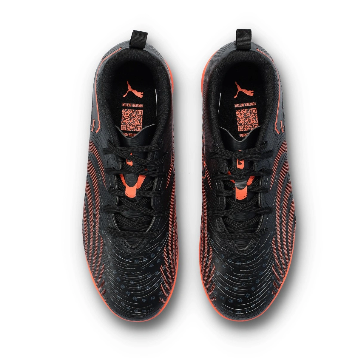 Chaussure de futsal Puma Future 9 Play IT à lacets pour enfants. Chaussures synthétiques pour terrains intérieurs. Chaussures haut de gamme en couleur Puma Black-Glowing Red-Strong G.