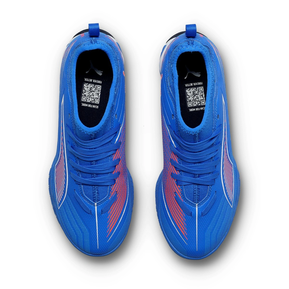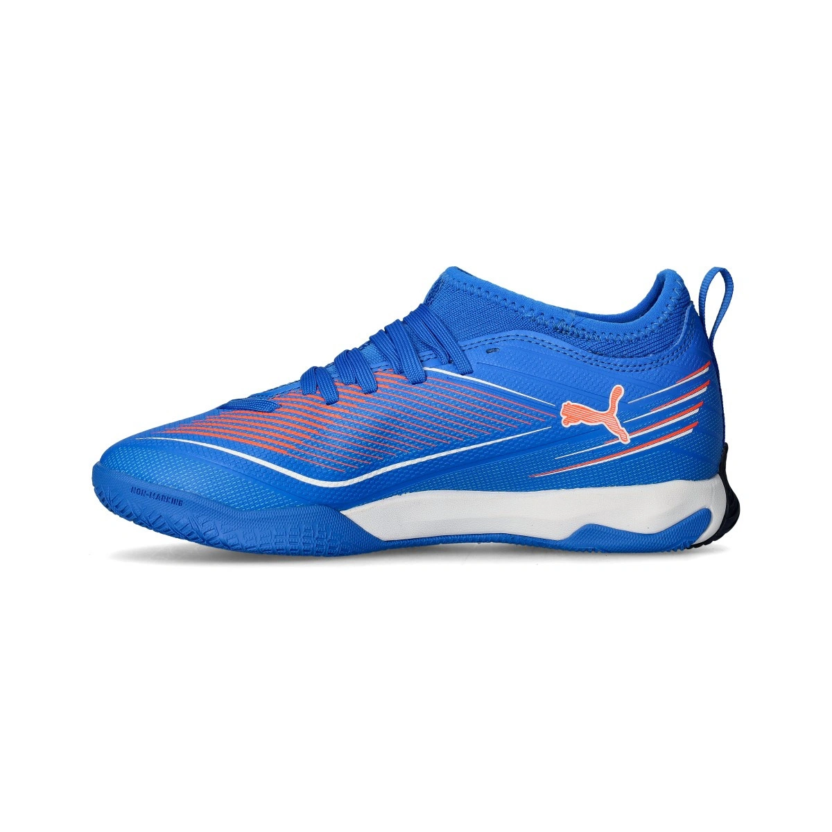 Chaussures de football Puma Ultra 6 Match IT + Mid pour enfants. Chaussures synthétiques pour utilisation sur terrains en béton et en parquet. Chaussures de milieu de gamme en Ultra Blue-White-Glowing Red.