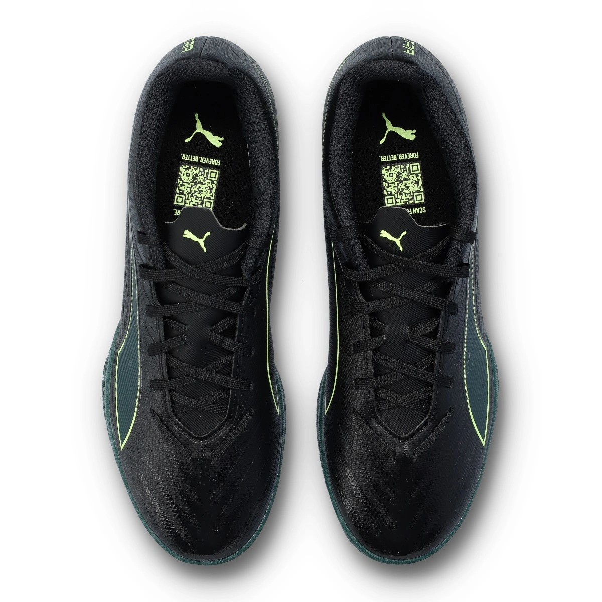 Chaussure de football Puma Ultra 6 Play IT. Chaussures synthétiques utilisermsur les terrains en béton et parquet. Chaussures millieu de gamme en coloris Black-Fizzy Light-Green Terrain.
