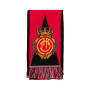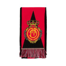 L'écharpe arbore fièrement les couleurs classiques du club, avec un élégant fond rouge traversé par un triangle noir qui évoque la force et la détermination de l'équipe. Le logo du RCD Mallorca est tissé avec soin au centre, entouré d'un écusson orné qui reflète la prestigieuse histoire du club dans l'élite du football espagnol.