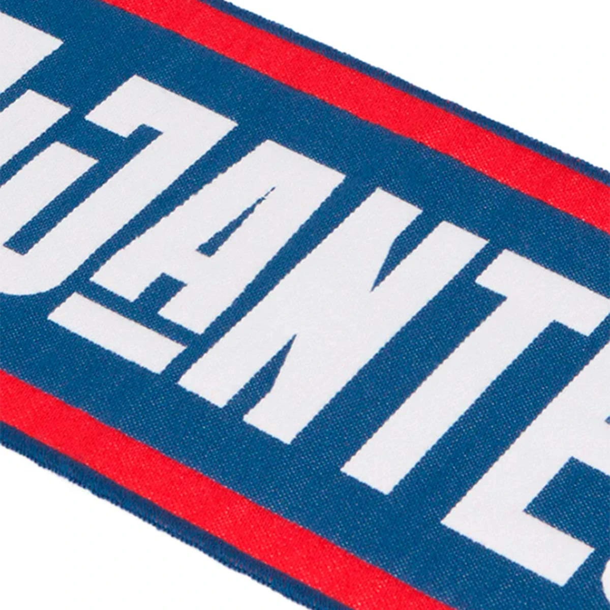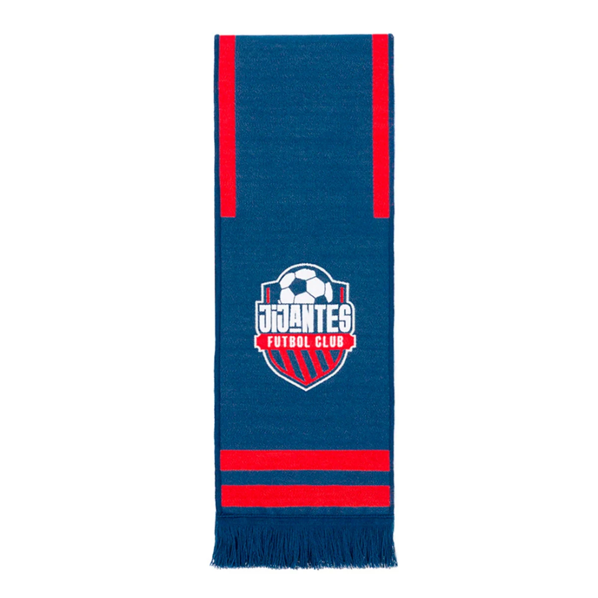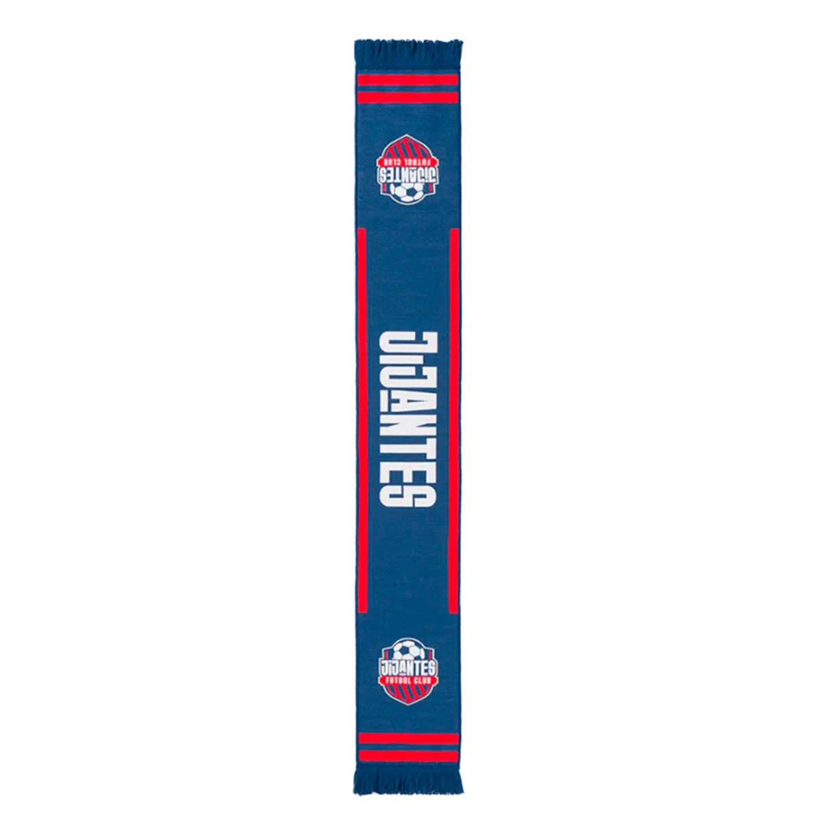 Écharpe à double tricot de l’équipe Jijantes FC de la Kings League, avec franges décoratives assorties. Couleur: bleu, rouge et blanc