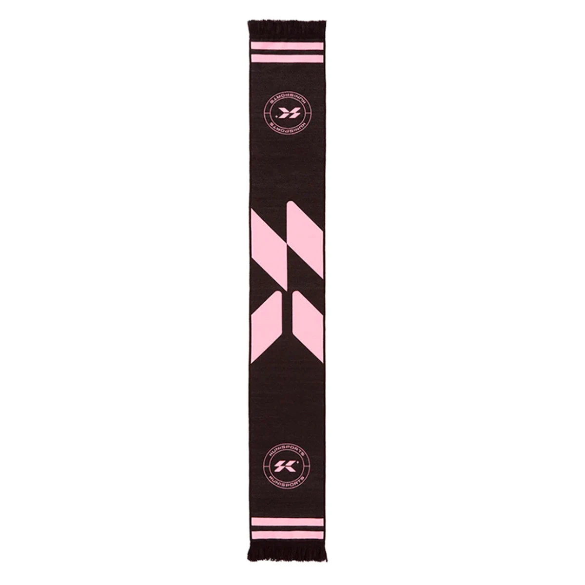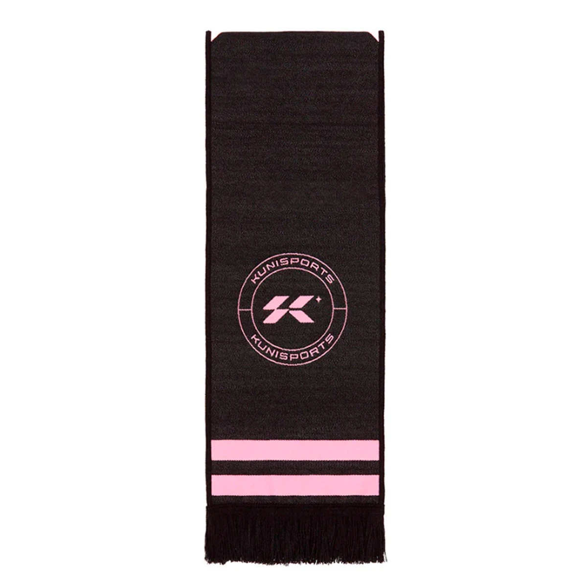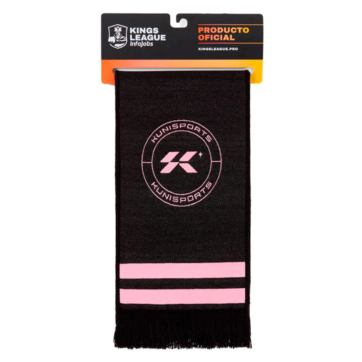 Écharpe à double tricot de l’équipe Kunisports de la Kings League, avec franges décoratives assorties. Couleur: noir et rose.