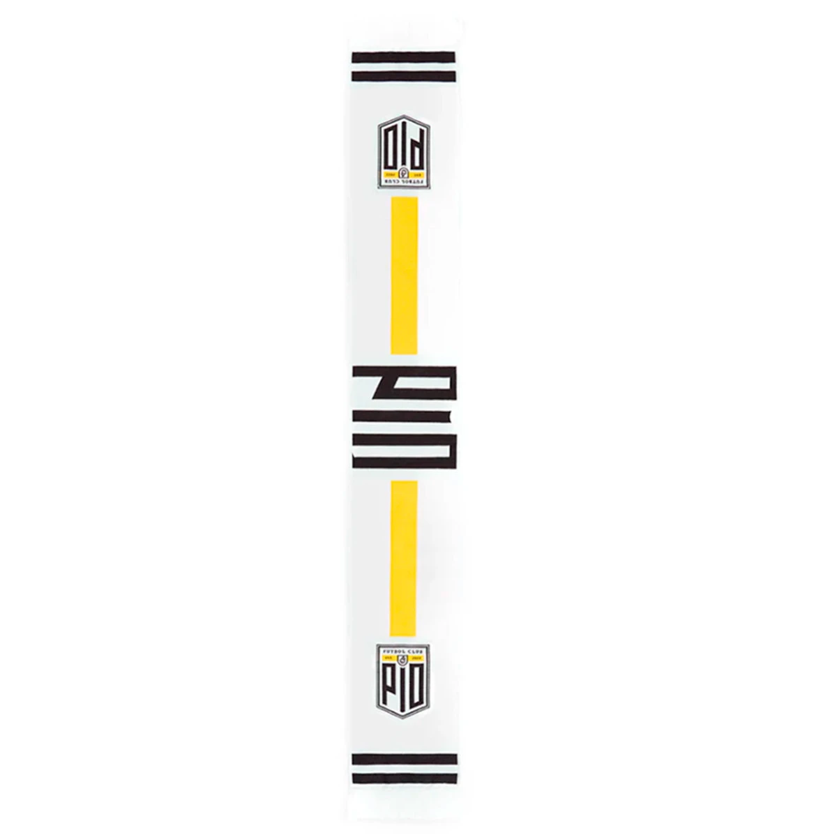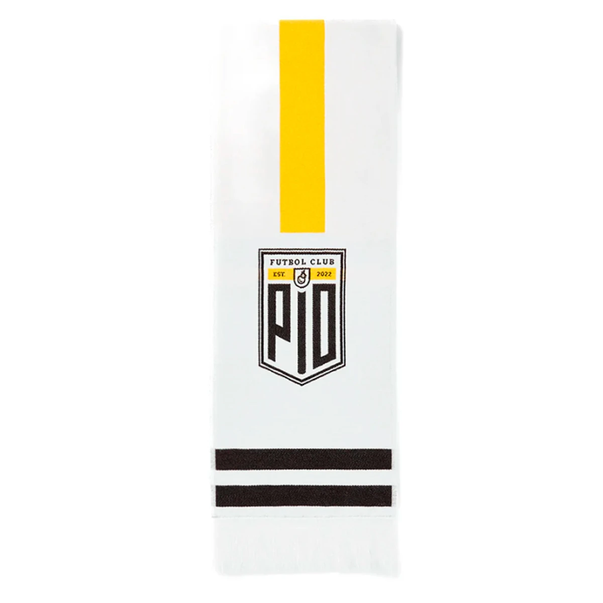 Écharpe à double tricot de l’équipe Pio FC de la Kings League, avec franges décoratives assorties. Couleur: jaune, noir et blanc.