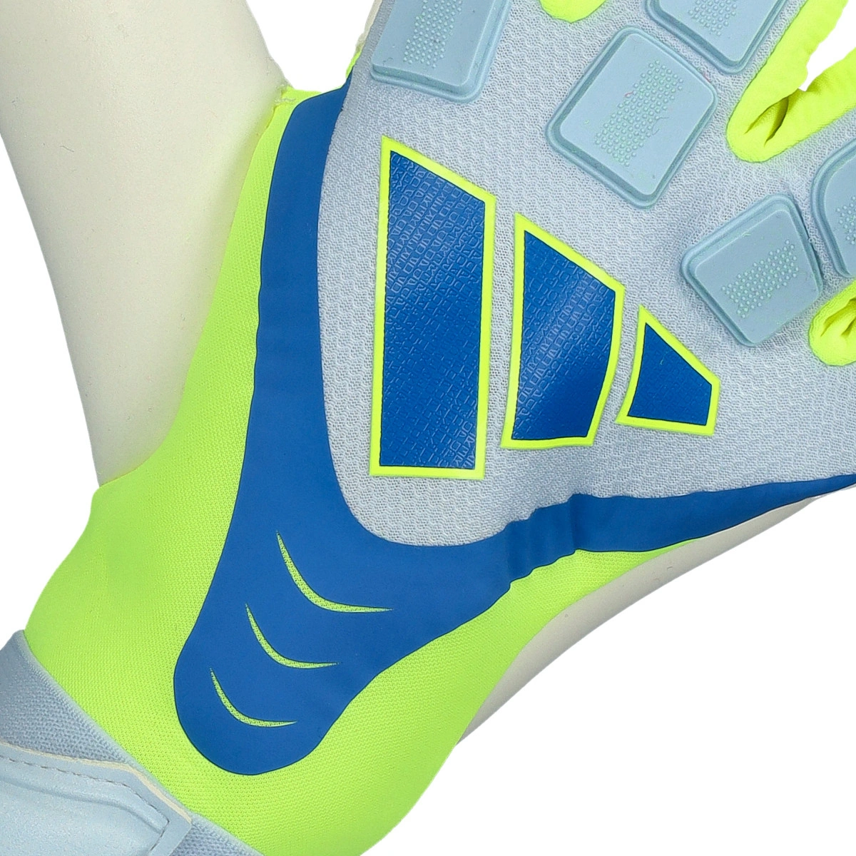 Gants de gardien Predator Competition d'adidas. Gants adulte en coloris Crystal Sky-Ray Blue-Solar Yellow montés en coupe Négative.