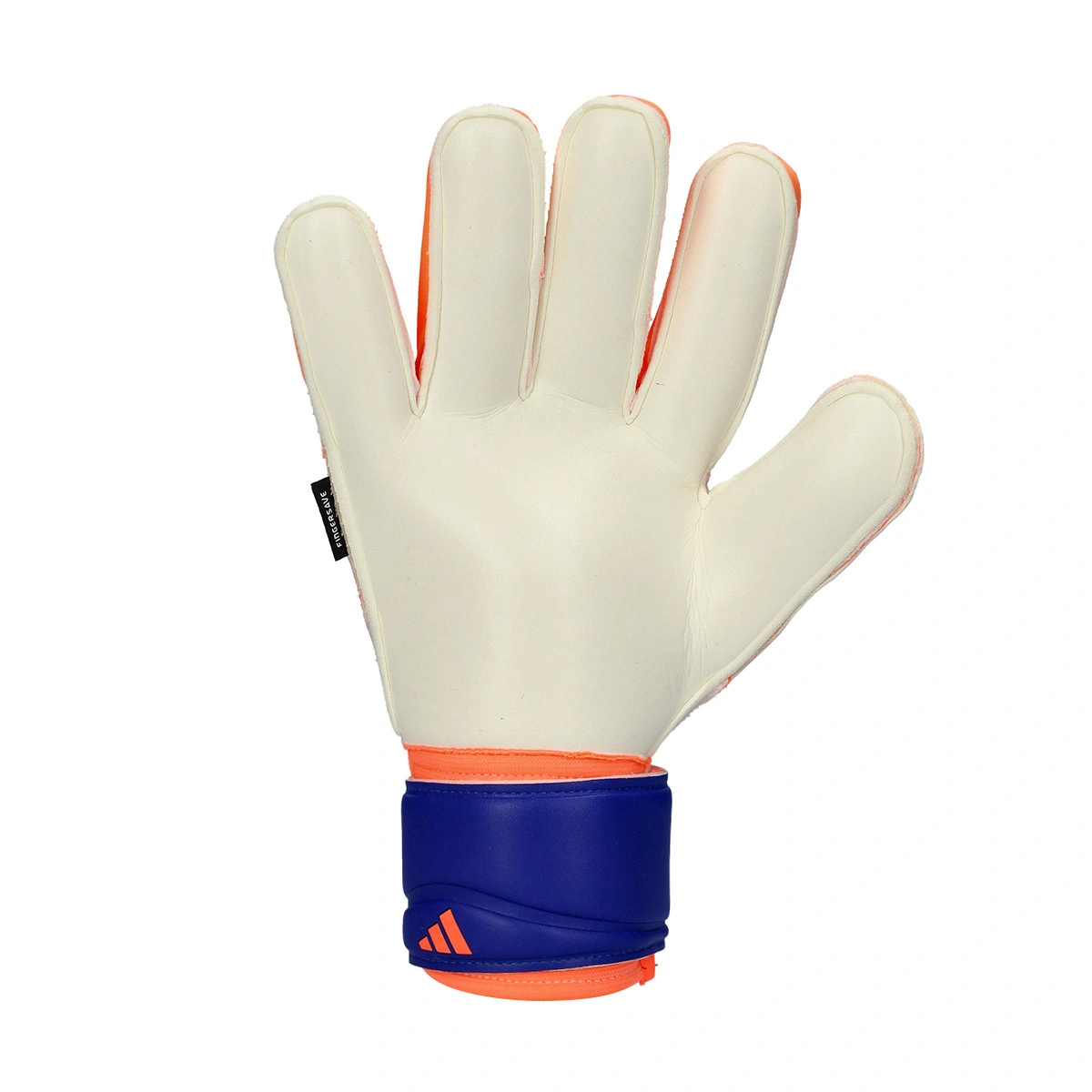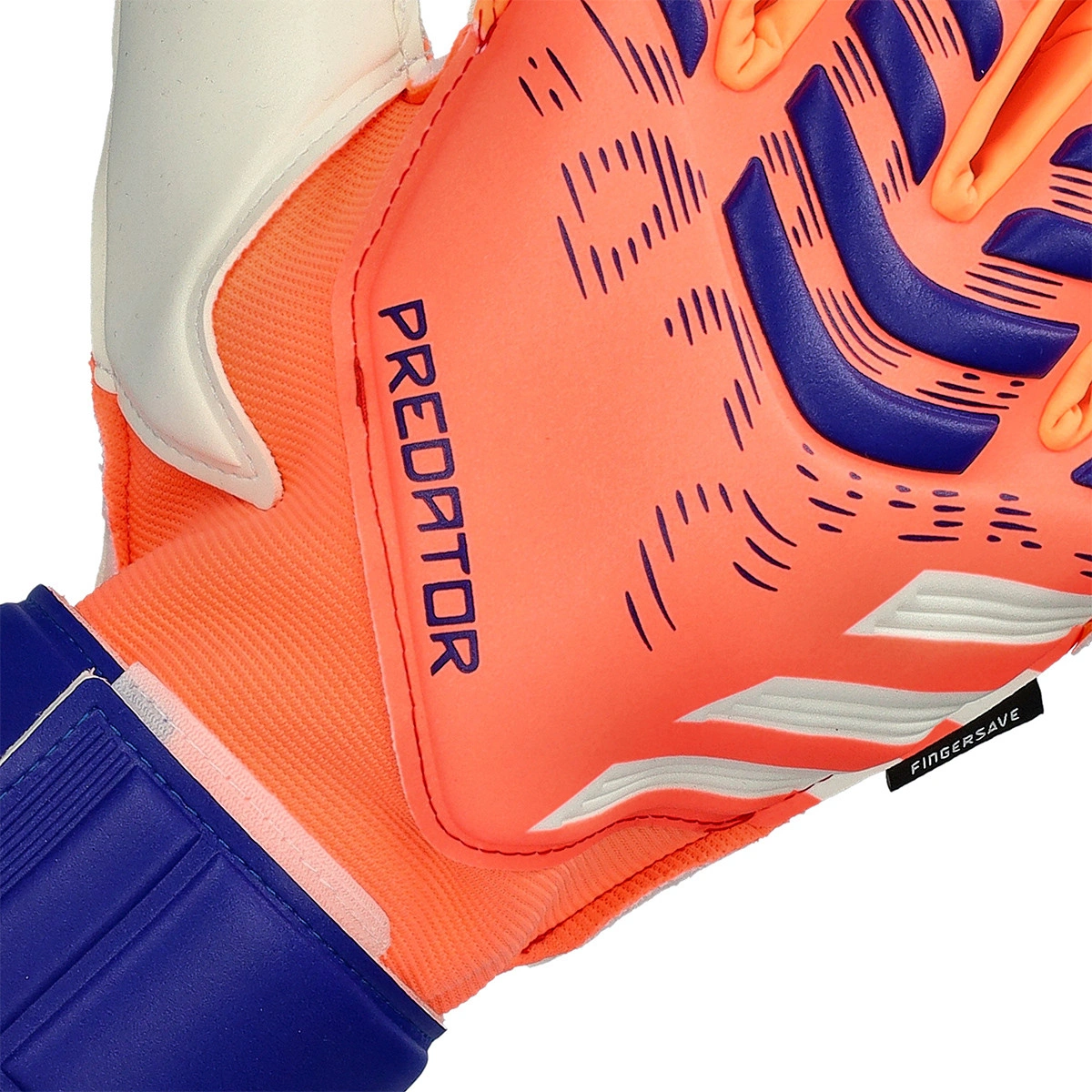 Gants de gardien de but Predator Match Fingersave par adidas. Gants pour adultes en Signal coral-White-Lucid blue avec une coupe flat.