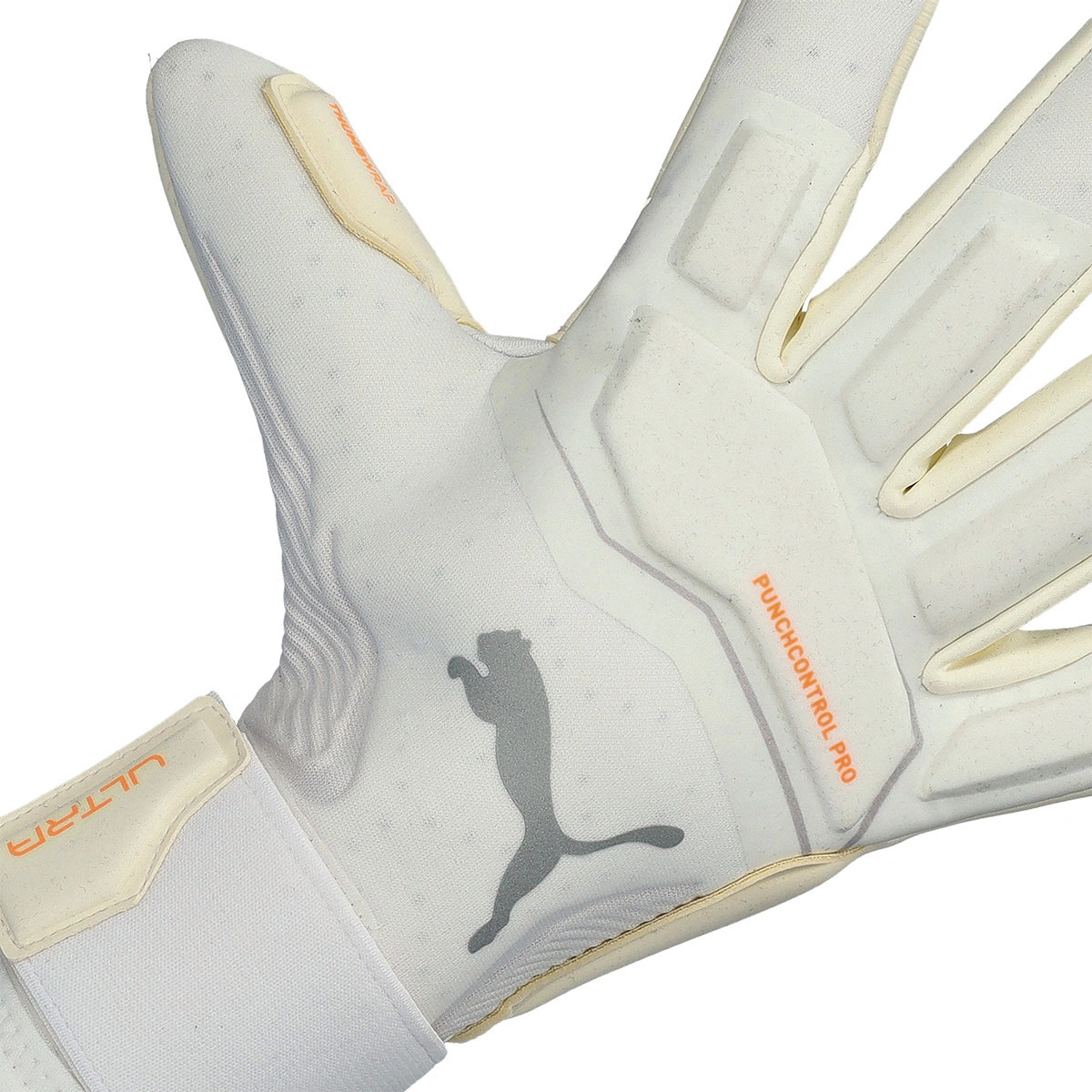 Gants de gardien Ultra Ultimate Hybrid pour adulte, en coloris Blanc-Argent-Heat Fire, avec coupe négative.