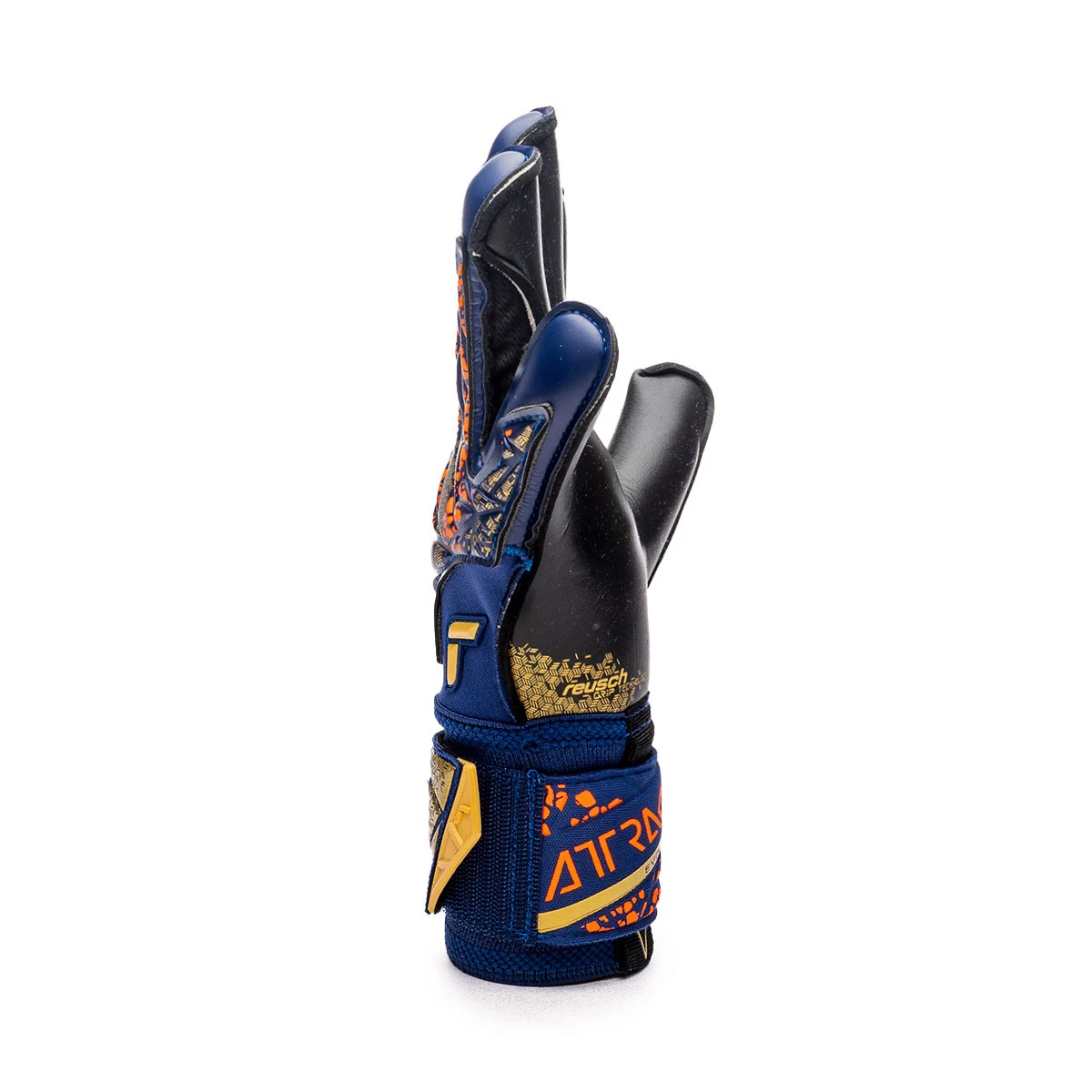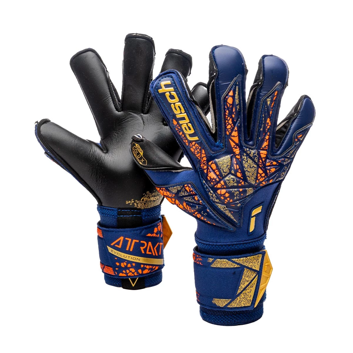 Gant de gardien de but Attrakt Gold X Evolution en bleu Premium blue-Gold-Black. Gant pour adulte en coupe négative.