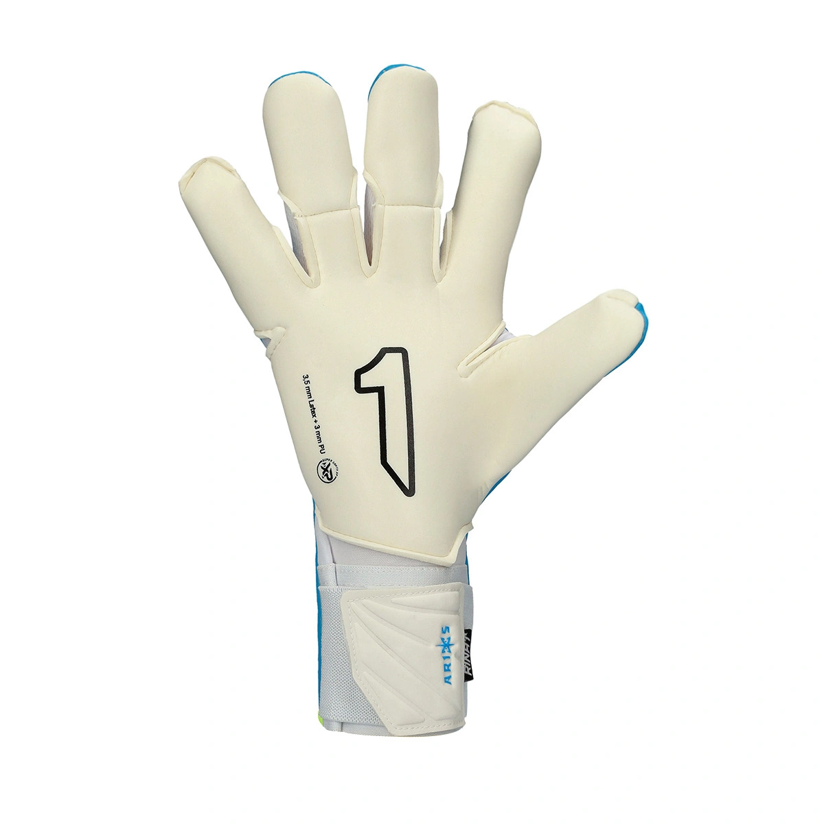 Gants de gardien de but Aries X Prime de la marque Rinat. Gants pour adulte de couleur Blue, coupe négative.