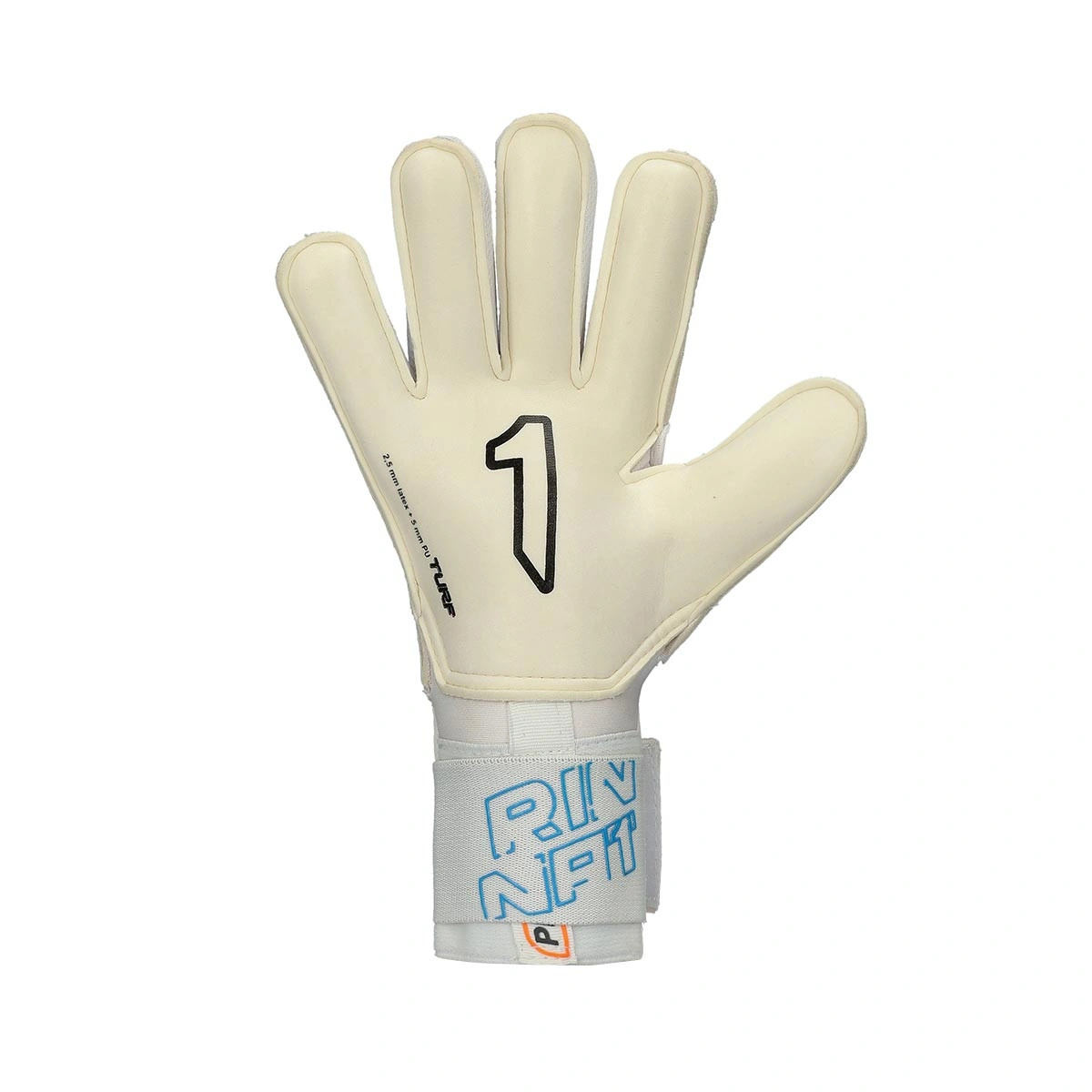 Gants de gardien Asimetrik Turf Enfant de la marque Rinat. Gants pour adulte de couleur White-Blue, coupe flat.