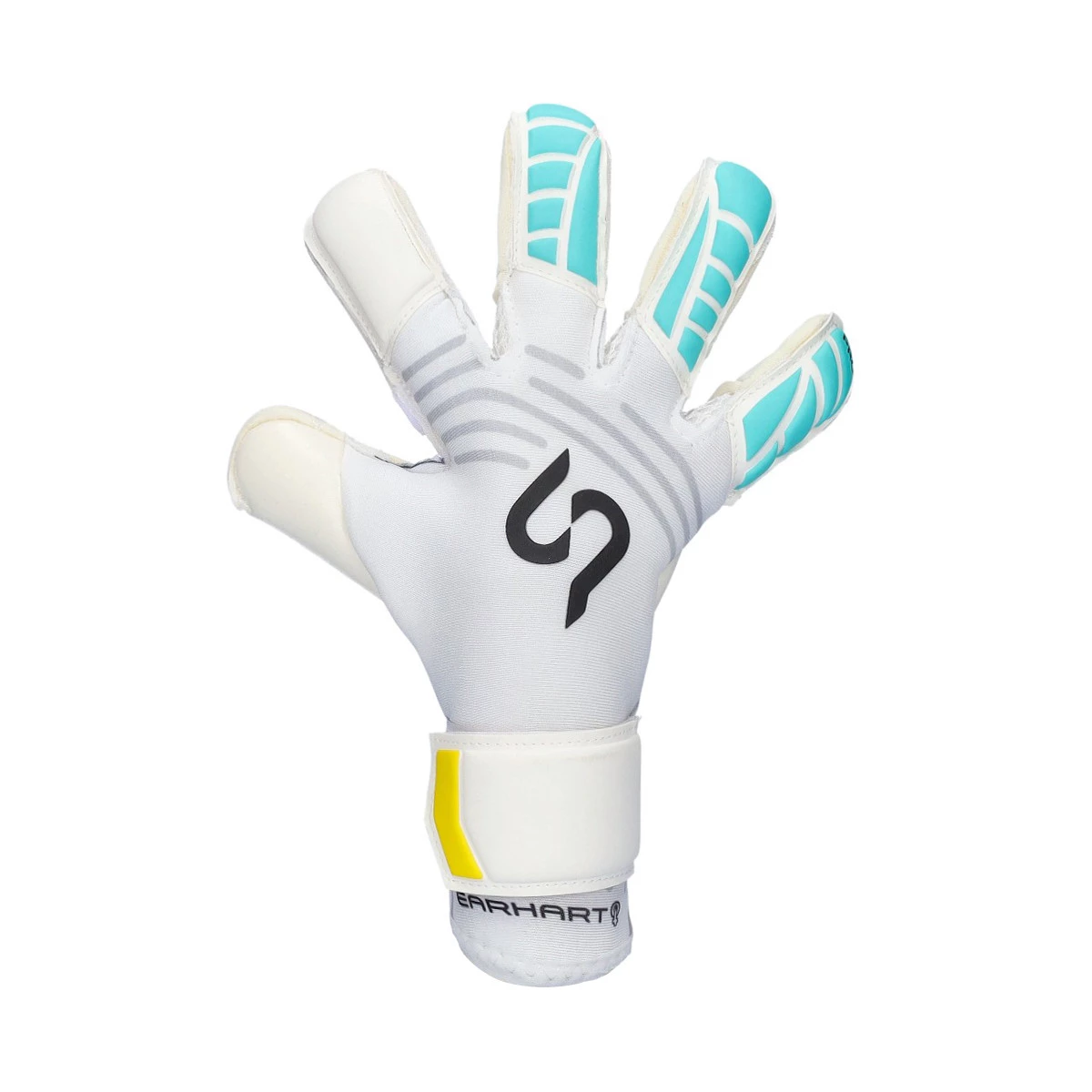 Gants de gardien de but Earhart Elite de la marque SP en coloris White-Cyan. Gants montés en coupe rollfinger.