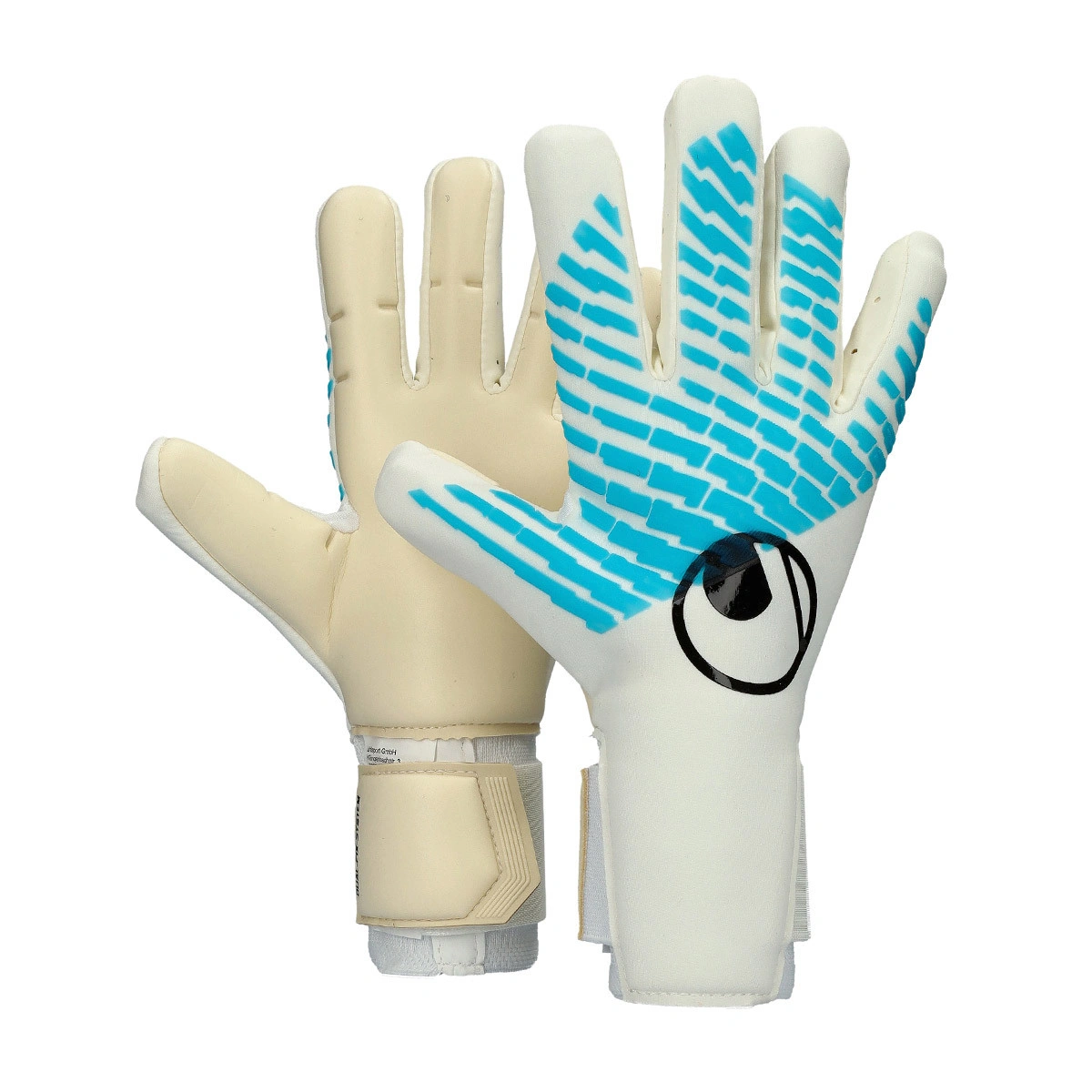 Gants de gardien Fangmaschine Cybertec Absolutgrip Hn Fit de la marque Uhlsport. Gants pour adulte de couleur blanc-cyan ciber, coupe négative.