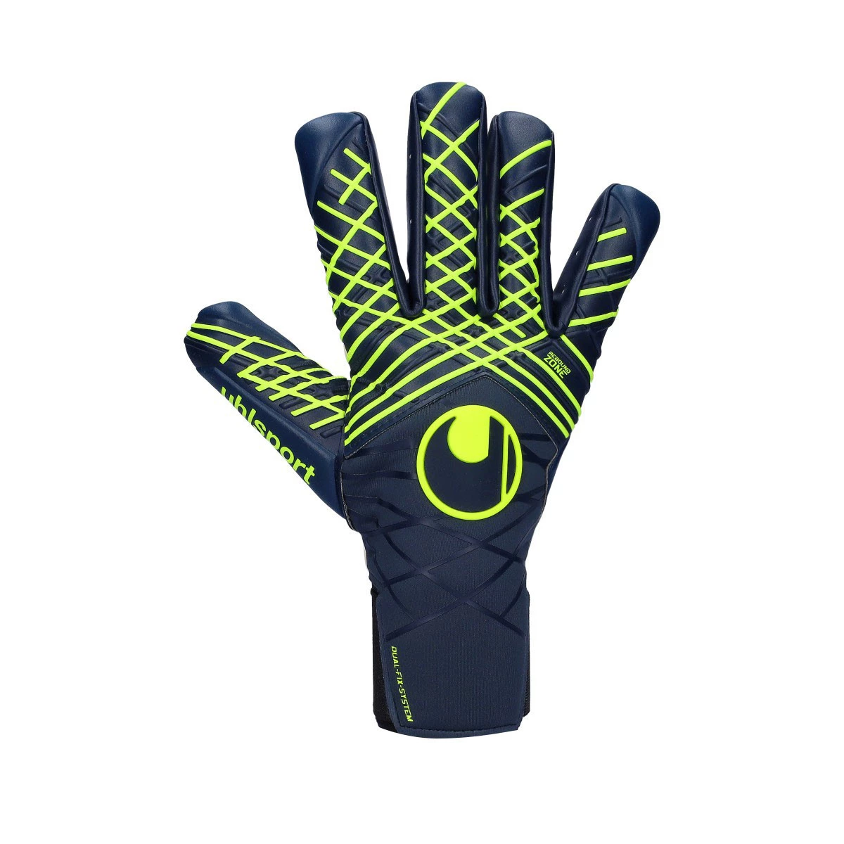 Gant de gardien de but Uhlsport Powerline Absolutgrip HN. Gant haut de gamme de couleur Dark blue-Yellow avec sangle réglable et coupe négative.