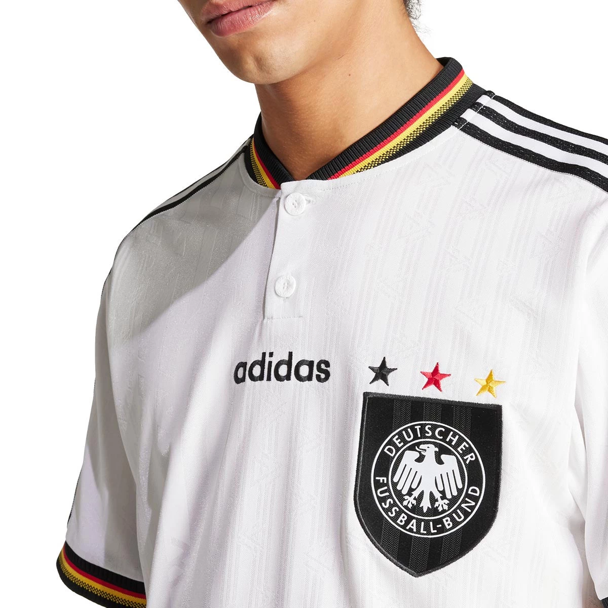 Avec un design à manches courtes identique au maillot domicile porté par l'Allemagne lors de ce tournoi, ce modèle évoque l'esthétique caractéristique des années 90 avec une coupe ample typique de cette époque, le logo adidas classique et l'écusson de l'équipe nationale cousus sur la poitrine. Et bien sûr, tous les détails originaux restent intacts, comme les 3 bandes discrètes sur les manches et le lettrage "DFB" intégré à l'imprimé. Portez-le et affichez votre style rétro au stade ou dans les rues de la ville.