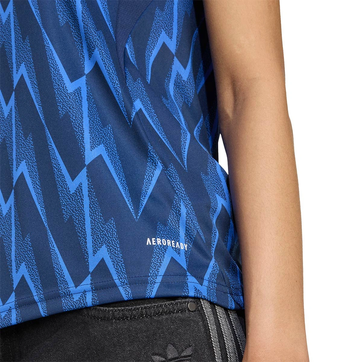 Pour cette saison, le maillot extérieur femme 2025-2026 remet à l’honneur ce design iconique avec un imprimé moderne couvrant toute la tenue en bleu clair et bleu foncé.