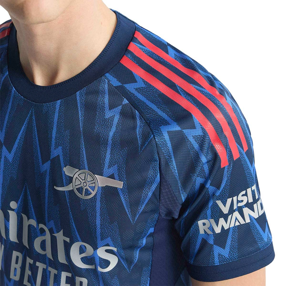 Si l’on retrace l’histoire d’Arsenal, on voit que l’éclair a toujours été présent. Pour cette saison, la seconde tenue 2025-2026 remet à l’honneur ce design iconique en grand format, avec un imprimé moderne couvrant toute la pièce en bleu clair et bleu foncé.