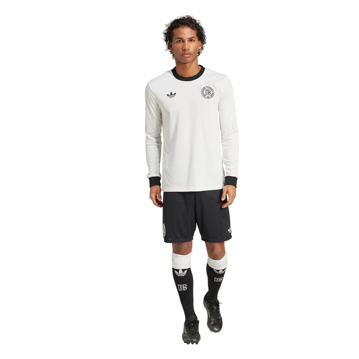 Célébrez le 125e anniversaire de l'équipe nationale allemande et son héritage avec la marque aux trois bandes. Inspiré par les kits rétro d'adidas, ce maillot de football est fabriqué en tissu jacquard doux avec un motif rayé subtil et un emblème d'aigle ton sur ton. La technologie respirante AEROREADY garde la peau sèche et offre un grand confort aux joueurs et aux supporters. L'inscription sur l'ourlet rend hommage à la plaque commémorant la fondation de la DFB (Fédération allemande de football) à Leipzig.