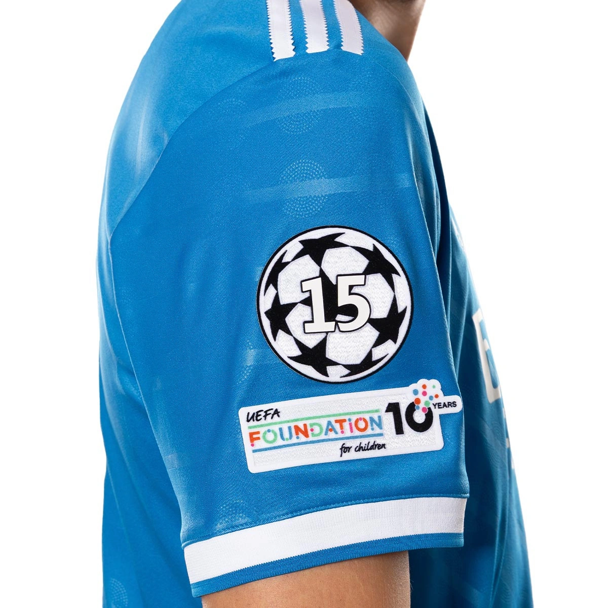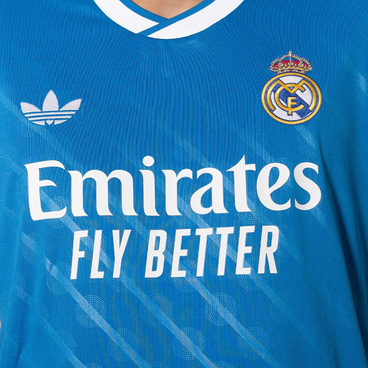 À domicile, nous portons du bleu. Découvrez le troisième maillot du Real Madrid pour la saison 2025-26, conçu par adidas. Cette version du maillot, dans une couleur classique adidas Originals, rend hommage à l'identité de l'équipe du Bernabéu. Les trois bandes dentelées et le trèfle font un clin d'œil à l'histoire de la marque.