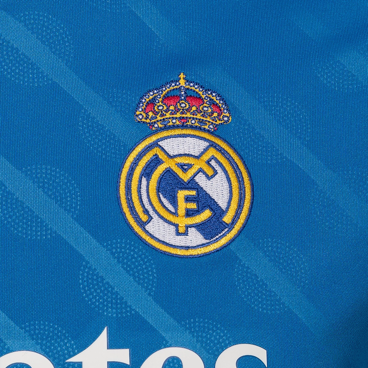 À la maison, nous portons du bleu. Ce maillot junior du troisième kit du Real Madrid pour la saison 25/26 arbore une couleur très appréciée par les Madridistas et les fans des trois bandes. Cette version pour enfants est personnalisée avec le nom et le numéro 10 de Kylian Mbappé, afin que les plus jeunes fans puissent fièrement porter les couleurs et l'étoile de leur équipe préférée.
