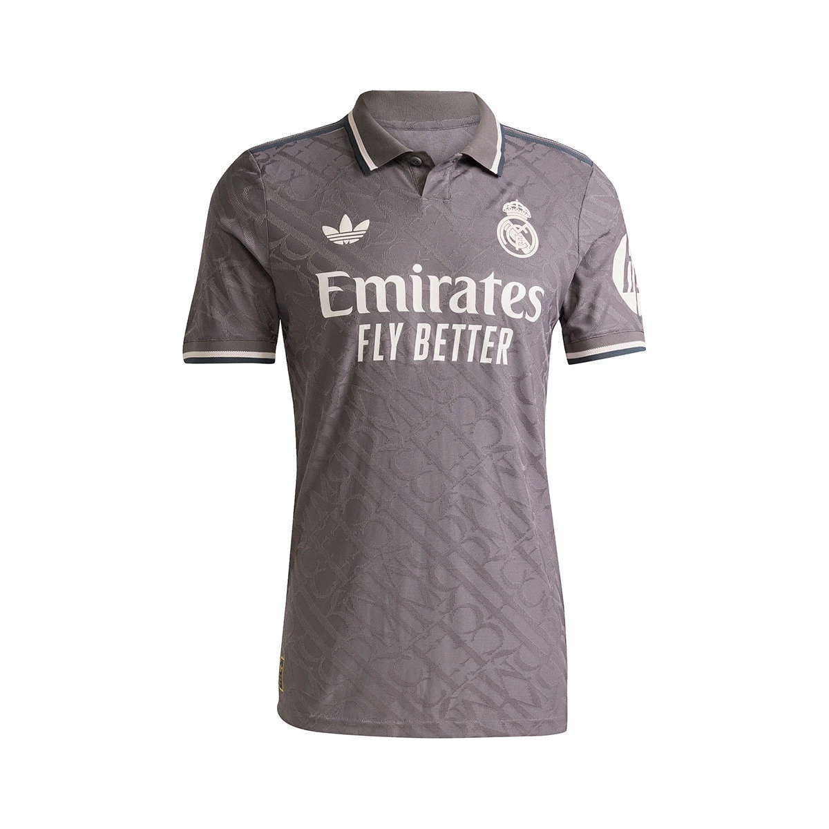 L'élégance est sa marque de fabrique. Ce troisième maillot du Real Madrid présente un monogramme avec les initiales "RMCF", inspiré des panneaux de signalisation traditionnels de Madrid. Longtemps absent d'un maillot de football adidas, le design ramène l'emblématique trèfle.