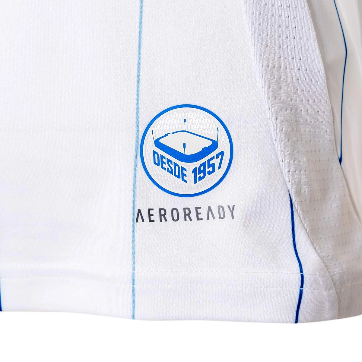 Maillot domicile du Real Zaragoza pour la saison 2024-2025. Coupe classique et modèle regular fit. Prédominance des couleurs de Saragosse, maillot blanc avec des détails bleus et de fines bandes verticales. Écusson caoutchouté sur la poitrine et détail des trois bandes de la marque adidas sur les épaules.