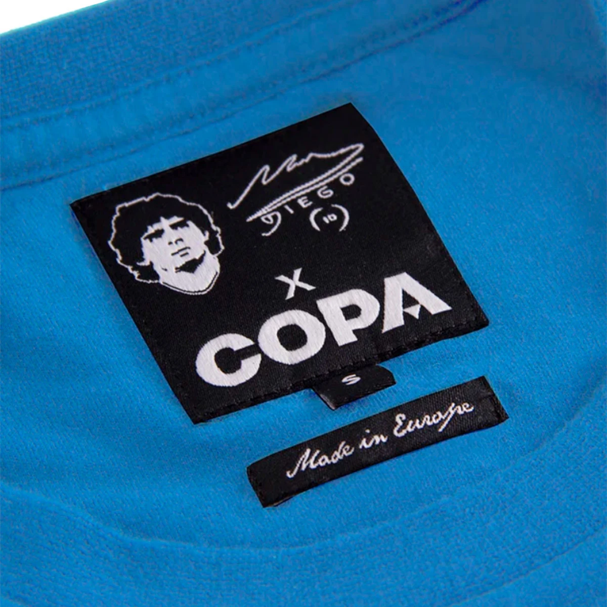 La figure que Diego Armando Maradonna s'est forgée dans le monde du football est incontestable : un numéro dix, un meneur de jeu, un talent hors du commun et bien plus encore..... La marque Copa lance la collection Diego Maradonna X COPA pour rendre hommage au plus grand joueur de football de tous les temps. Découvrez le T-Shirt Maradona Napoli Away.