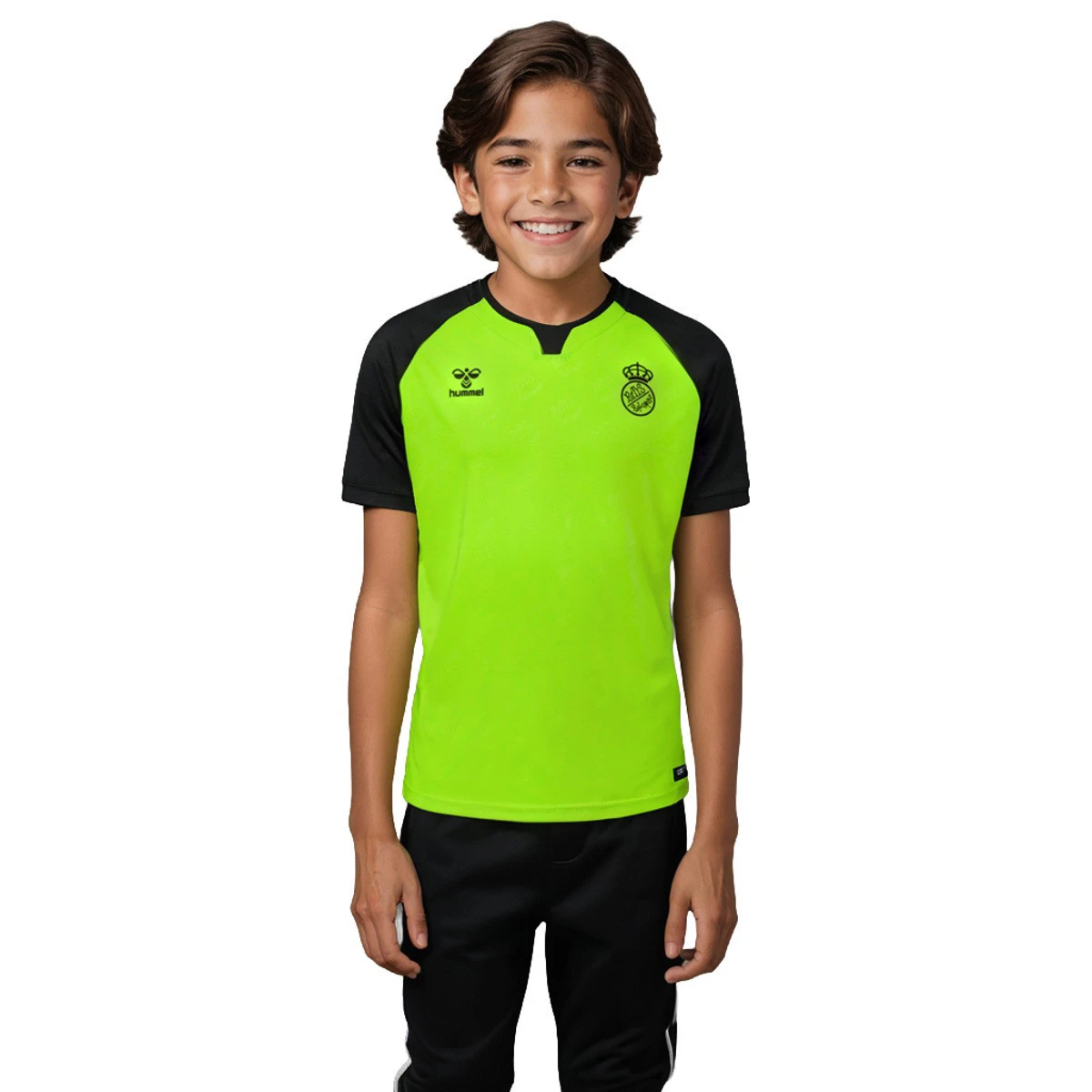 Le maillot extérieur du Real Betis pour la saison 2024-2025, version enfant, est conçu avec une couleur de base jaune néon et des manches noires, en hommage aux couleurs originales du club de 1914. L'avant et l'arrière jaunes présentent un logo rétro inspiré du Betis gravé dans le tissu, tandis que le logo du club et celui de Hummel sont visibles sur la poitrine.