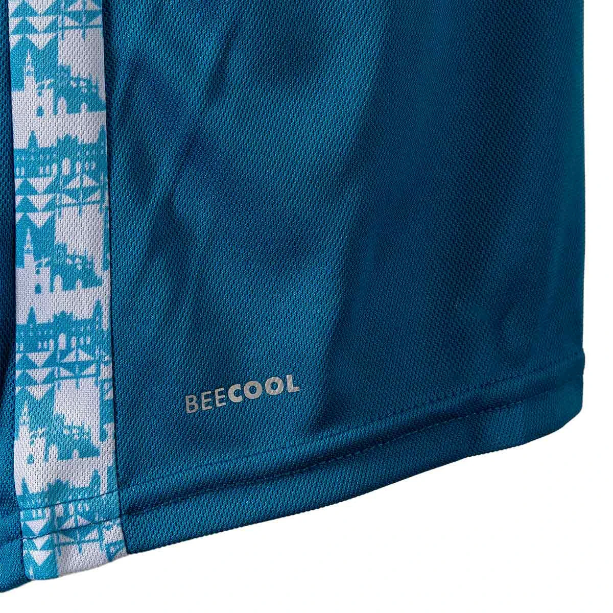 Real Betis Balonmpie Third Kit 24/25 pour enfants. Le nouveau kit présente deux nuances de bleu différentes, l'une plus intense et l'autre turquoise pour les détails des manches et du col.