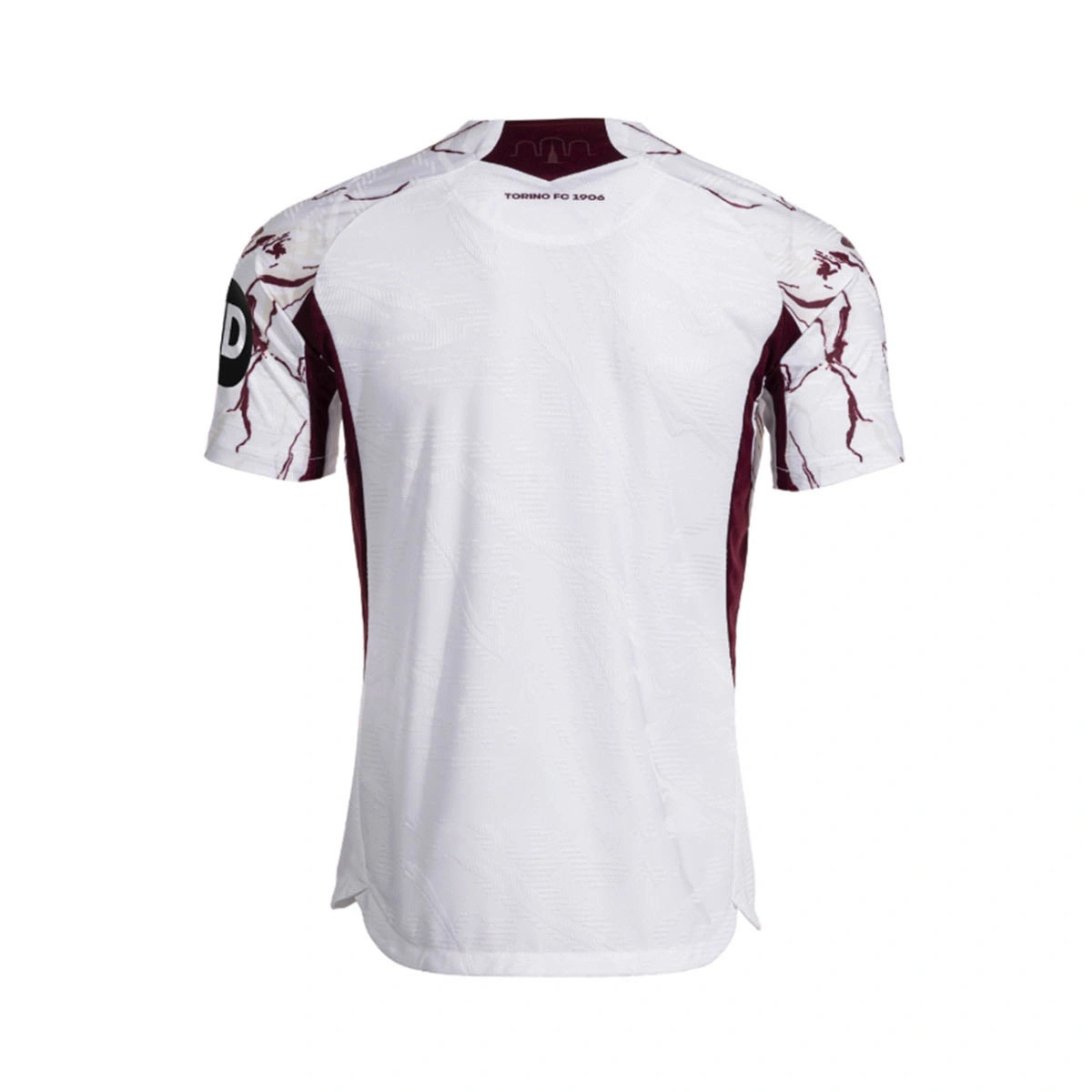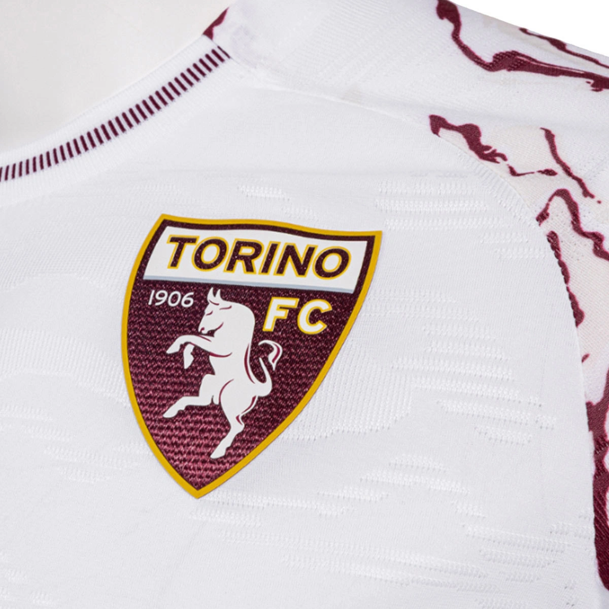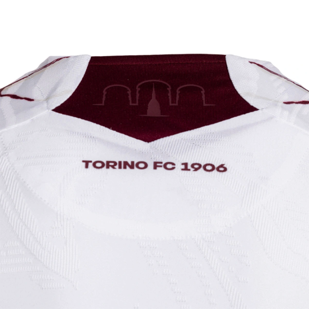 Maillot extérieur du Torino FC pour la saison 2025/2026. Le maillot de la deuxième tenue du Torino FC se distingue par un élégant motif sublimé qui parcourt tout le vêtement, particulièrement mis en valeur sur les manches, où il arbore les couleurs caractéristiques du club. Il intègre également une finition jacquard qui apporte texture et distinction au design.