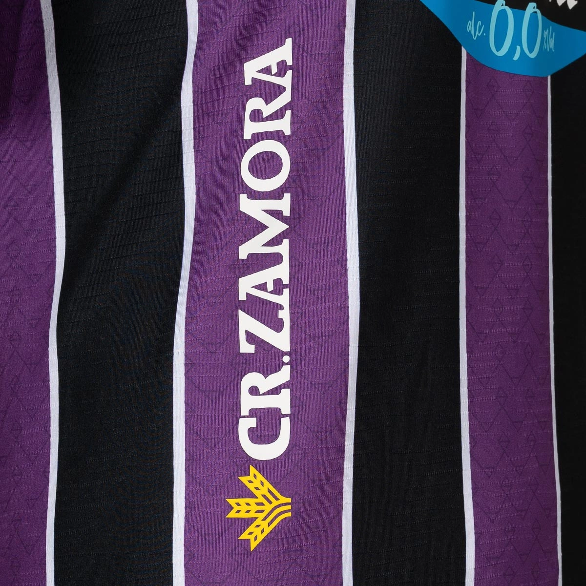 Aujourd'hui, cette énergie revient sous forme de design, avec une réinterprétation élégante et émotionnelle. Le noir profond est associé à des rayures violettes verticales, qui suggèrent un « V » stylisé, symbole de Valladolid et de son lien avec le premier maillot. Le résultat est une pièce qui respire l'histoire, mais qui projette le présent et l'avenir.