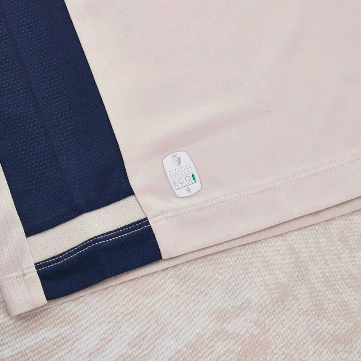 Le maillot de la deuxième équipe d'Osasuna pour la saison 2024-2025 exprime l'union entre le club et son territoire. Réalisé dans un coloris gris sable clair, il est enrichi de détails bleu marine, notamment le bord des manches, le col en V et les bandes latérales.