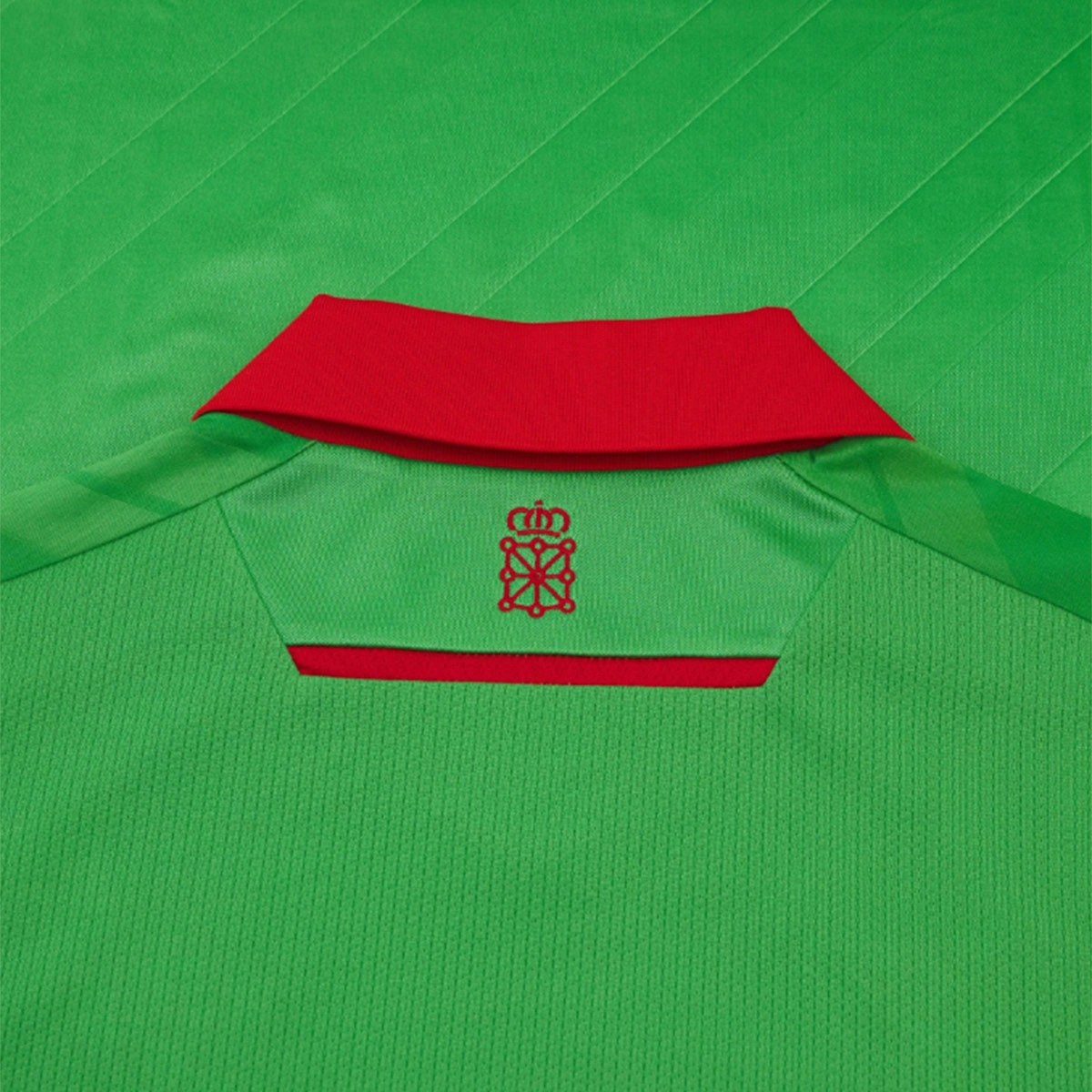 Le maillot extérieur d'Osasuna pour la saison 2025/26 se distingue par une base verte éclatante traversée par un motif diagonal en relief qui apporte rythme et personnalité au design. Le col polo et les bords des manches en rouge contrasté rappellent l'une des couleurs traditionnelles du club.