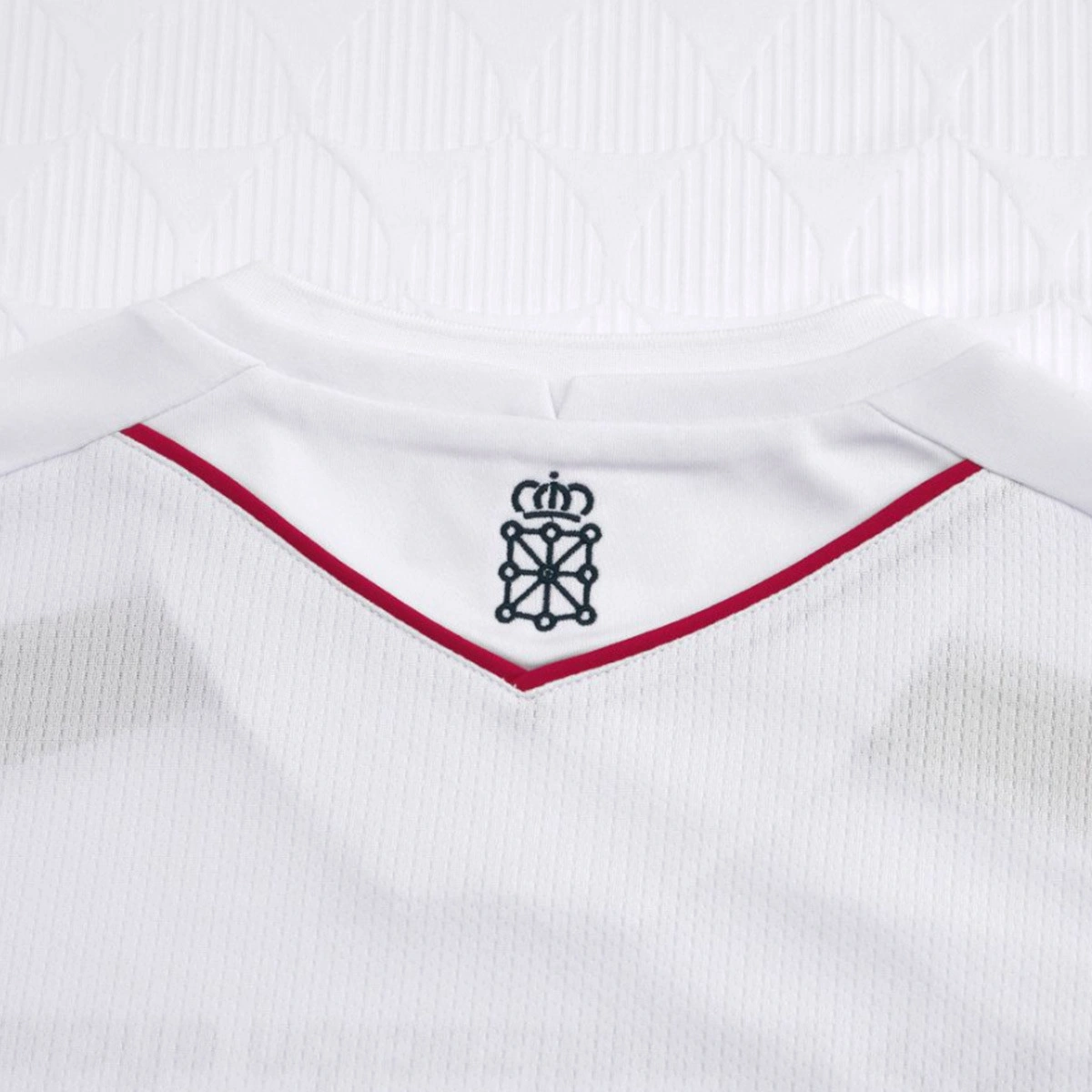 Le troisième maillot d'Osasuna 2025-2026 se présente dans un blanc élégant, enrichi d'une texture géométrique en relief qui apporte profondeur et caractère au design. Les détails bleu marine et rouge, tels que les finitions du col, des manches et des côtés, ajoutent une touche percutante qui renforce l'identité visuelle du club. À l'arrière du col, un élément graphique distinctif se détache, tandis qu'à l'intérieur, dans la partie inférieure, un ruban personnalisé a été appliqué pour célébrer l'histoire européenne de l'équipe.