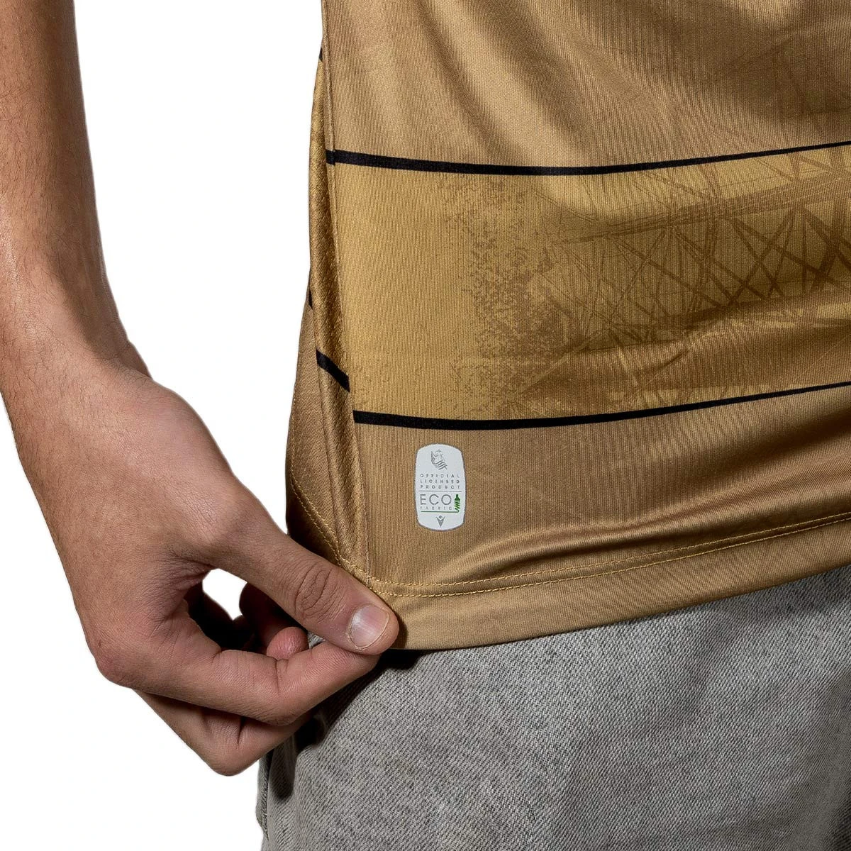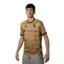 Le Maillot Away de la Real Sociedad 2024-2025 se distingue par une élégante combinaison de noir et d'or, rehaussée de motifs subtils. Ce maillot extérieur arbore un col rond classique, tandis que les manches sont décorées de fines lignes noires au style flouté. Des bandes horizontales dorées, alternant entre finitions brillantes et mates, ajoutent une touche de raffinement. Les détails graphiques dégradés créent un effet de vaporisation unique, évoquant le célèbre toit du stade emblématique de notre club adoré.