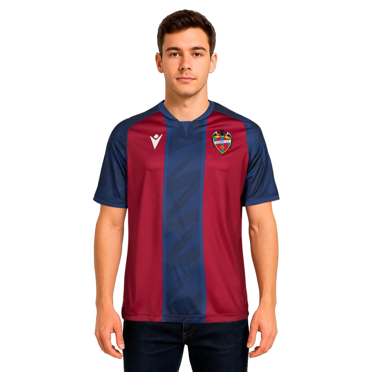 Portez le maillot domicile 2024-2025 de l’UD Levante, qui arbore cette saison les couleurs traditionnelles bleu marine et grenat du club. Il présente un design composé de trois bandes verticales bleues et deux grenat. Des motifs graphiques subtils sont visibles sur les bandes bleues.