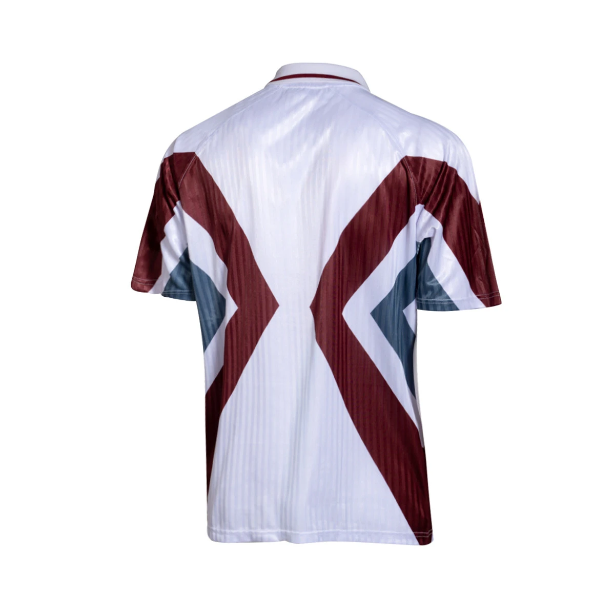 Maillot de football de style rétro, imprimé et fabriqué en tissu polyester avec des touches mates et brillantes. Conçu avec des touches qui rappellent les maillots des années 80 sur le terrain. Détail de l'écusson sur la poitrine et graphiques vintage sur l'ensemble du maillot.