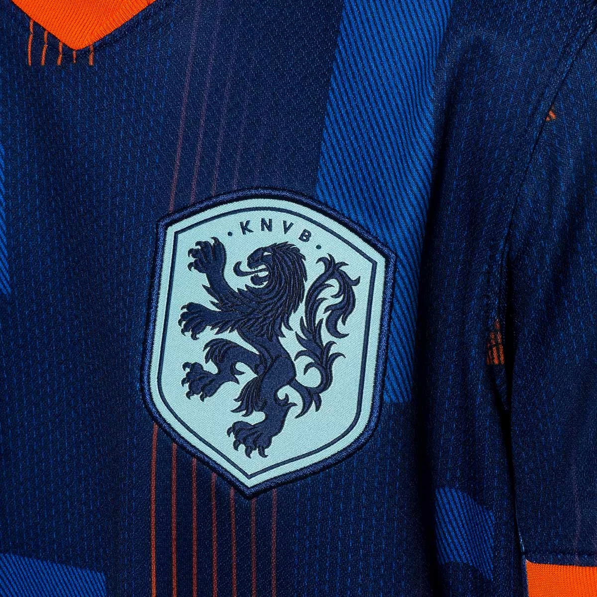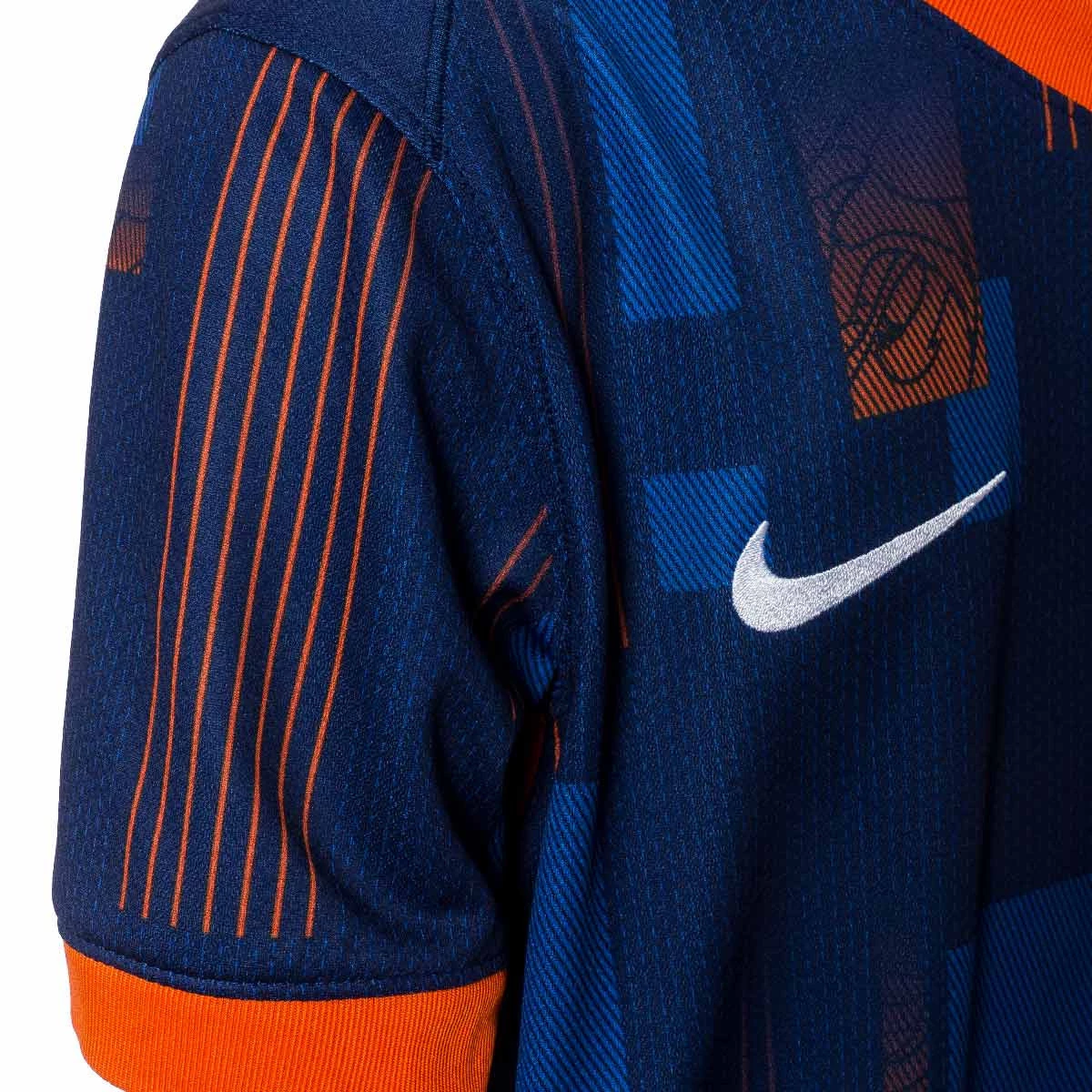Le maillot extérieur de Hollande Euro 2024. Ancré dans l'identité de Hollande, leur kit extérieur 2024/25 est d'un bleu énergique avec des détails orange emblématiques. Le motif imprimé est inspiré du mouvement artistique néerlandais De Stijl. Des détails subtils de lion et de lionne se trouvent à l'intérieur, un clin d'œil à l'héritage de l'équipe.