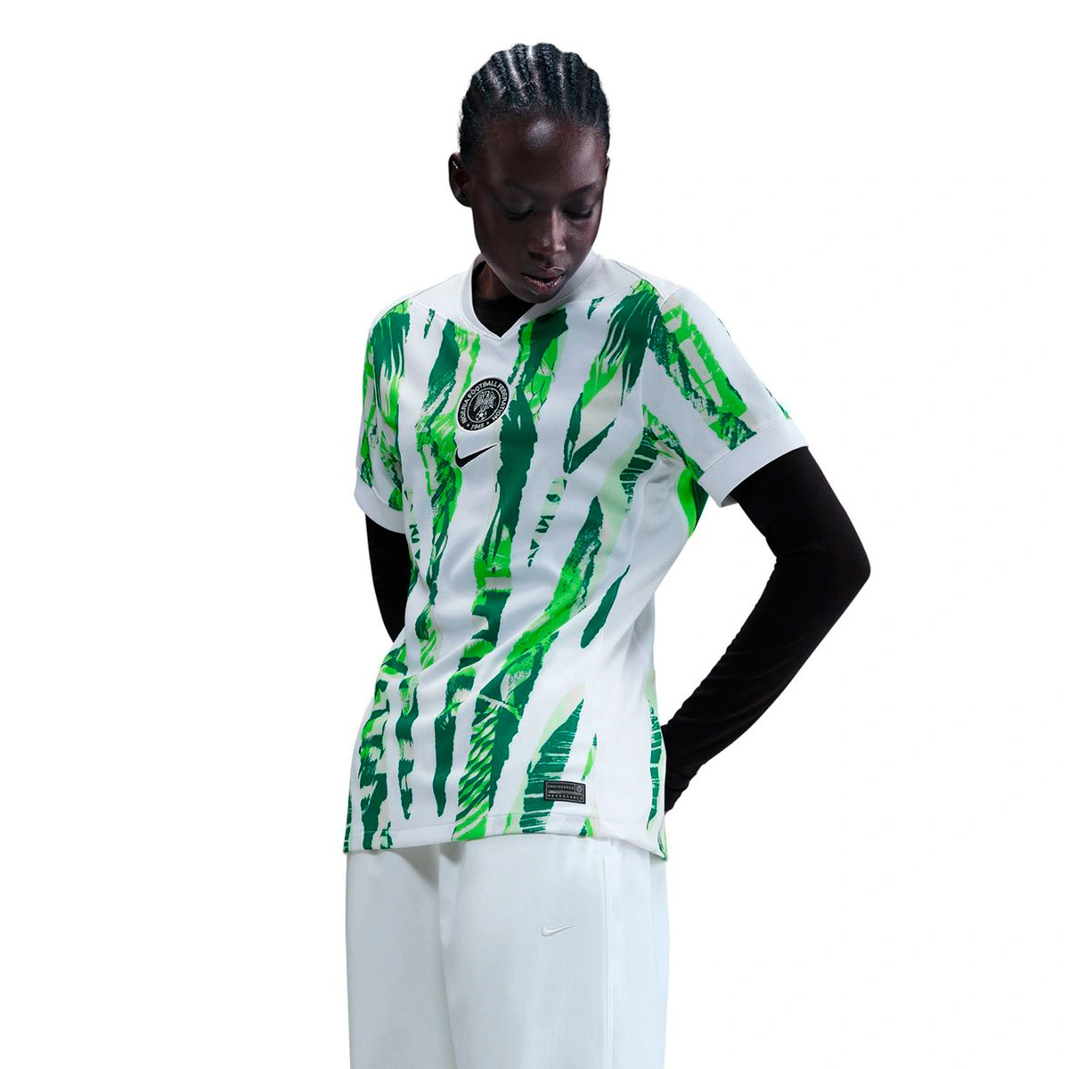 Le maillot extérieur du Nigeria pour la Coupe d'Afrique féminine 2025 s'inspire des marchés de Lagos et de Sokoto. Évoquant les rayures du drapeau nigérian, les couches de textures vibrantes forment un collage graphique qui célèbre le dynamisme et les échanges culturels de ces lieux divers et passionnants.