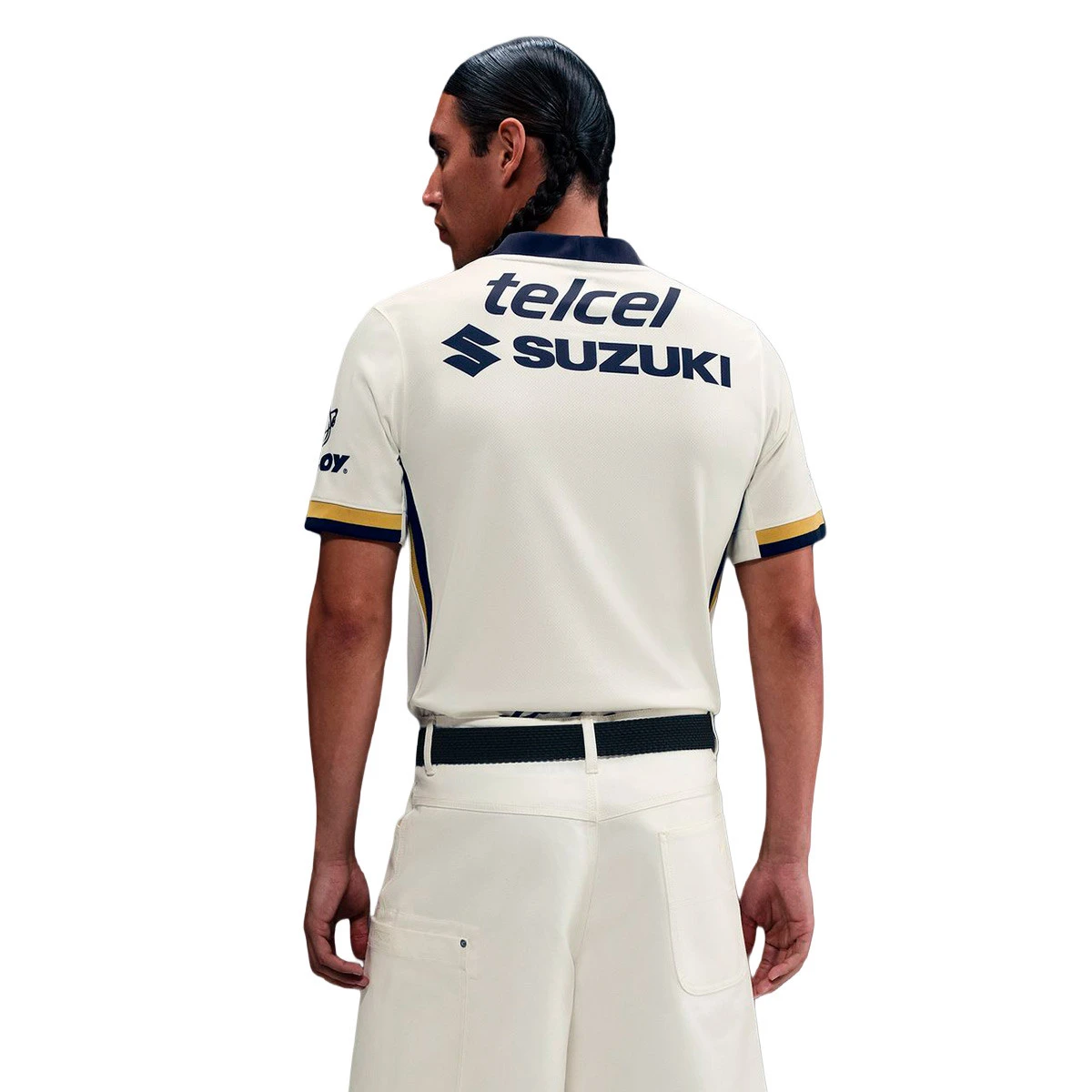 Le maillot domicile des Pumas UNAM pour la saison 2025-2026 est une déclaration d’amour au stade légendaire du club. La base blanche représente les matériaux bruts du stade, tandis que les lettres personnalisées s’inspirent de l’accès au terrain de jeu. Les détails en or et obsidienne complètent cette ode à ce lieu emblématique où ils jouent à domicile.