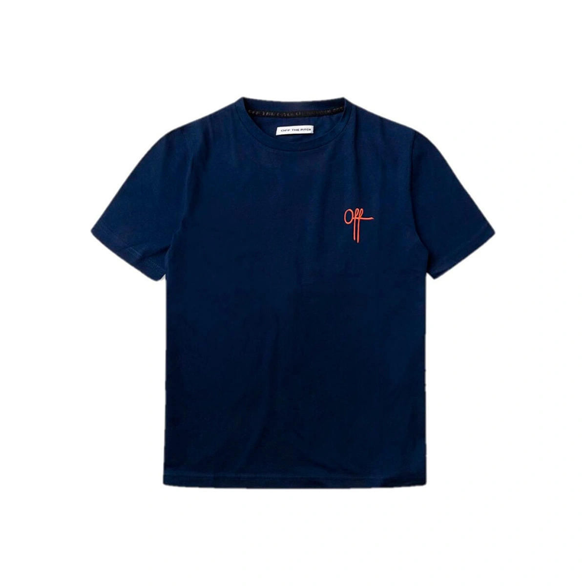 T-shirt à manches courtes Off The Pitch. T-shirt bleu marine avec une coupe régulière, un col rond et le logo de la marque sur le devant en petit et une grande impression du même sur le dos du t-shirt.