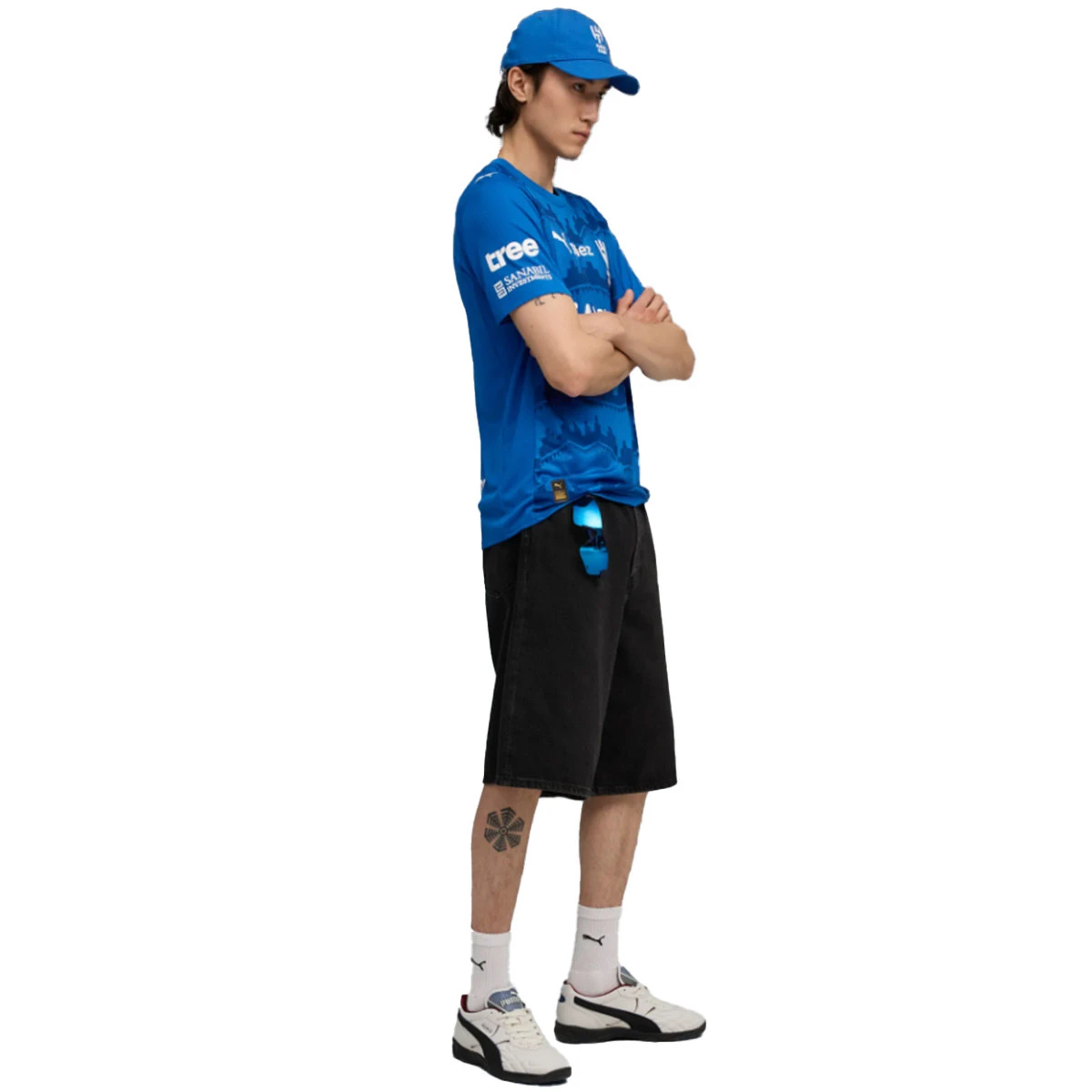 Le bleu intense, associé à des détails éclatants dans une teinte plus claire, crée un contraste saisissant qui attire les regards aussi bien sur le terrain qu’en dehors. Les motifs géométriques ornant l’avant du maillot apportent non seulement une touche moderne, mais rendent aussi hommage aux racines culturelles du club.